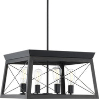 Create a rustic atmosphere with a chandelier from the Briarwood Collection. Light sources exude a comforting country glow through the X-brace design reminiscent of country barn doors and rustic farmhouse gates. The faux wood frame is coated in a cerused black oak finish with textured black accents. Compatible with dimmable bulbs.
