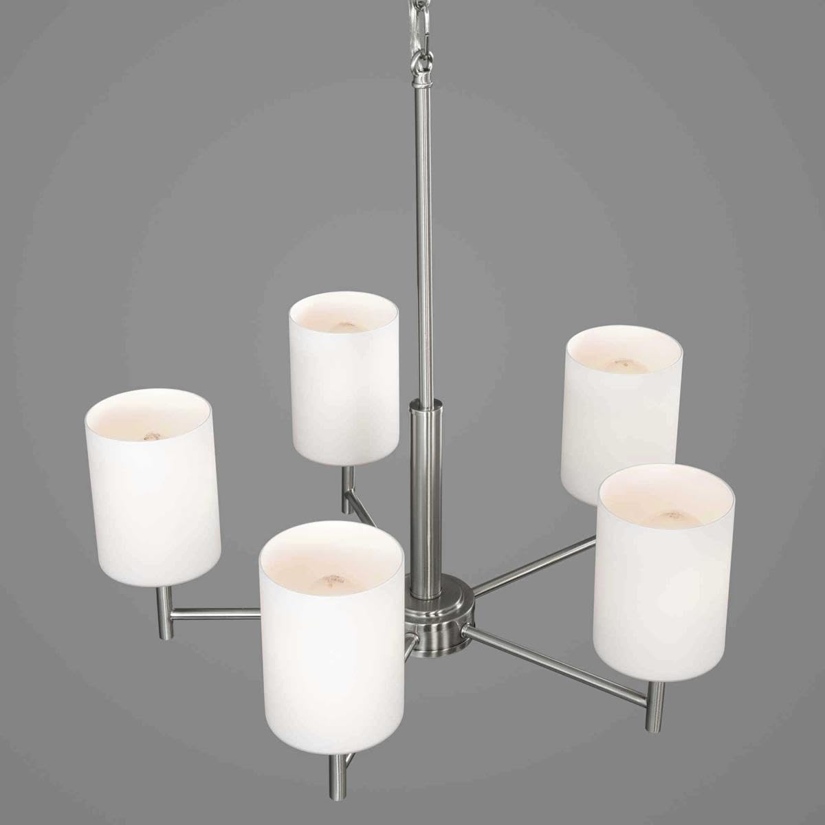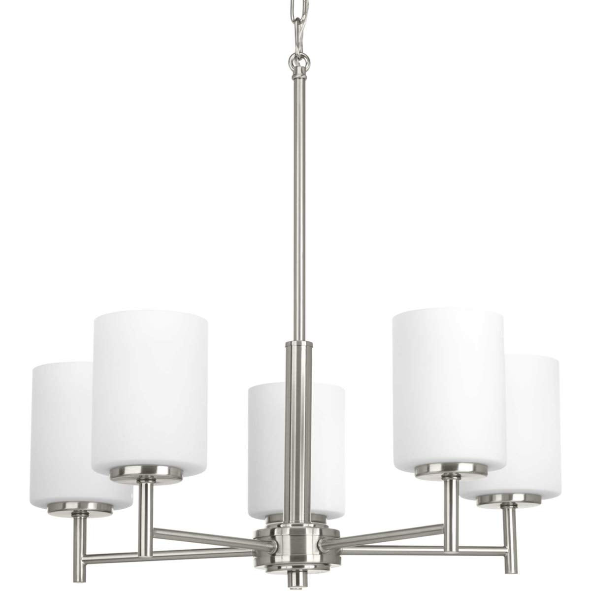 Five-Light Chandelier From The Replay Collection Features A Linear Form That Provides A Pleasingly Elegant Accent To Your Home. A Sleek, Metallic Finish Is Complemented By White Glass Diffusers For A Clean, Modern Silhouette. Brushed Nickel Finish.