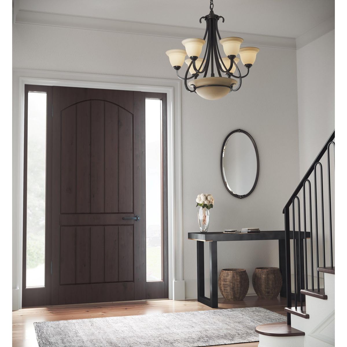 Product DescriptionElegantly formed six-light, two-tier chandelier featuring soft tea-stained glass. A provided three-light downlight in an oversized, bell-shaped glass bowl adds greater distinctive lighting. Characteristic ebbing and flowing of flat steel arms and scroll accents are hand painted in a Forged Bronze finish entailing black and brown tones. With a timeless appeal, this Torino fixture is supplied with six feet of 9 gauge chain for ceiling chain mount.From the ManufacturerCasual and rustic with a certain modern flair, the Torino Collection features a scrolled frame in a rich bronze finish that captures lightly ambered glass shades with a unique textured pattern. 6-Light, 2-Tier chandelier with 3-Light downlight in tea stained oversized, bell-shaped glass bowl. Distinctive ebbing and flowing of squared scrolls and arms in Forged Bronze finish. Uses (6) 100-Watt medium base bulbs 28-5;8-Inch Diameter by 29-7;8-Inch Height.