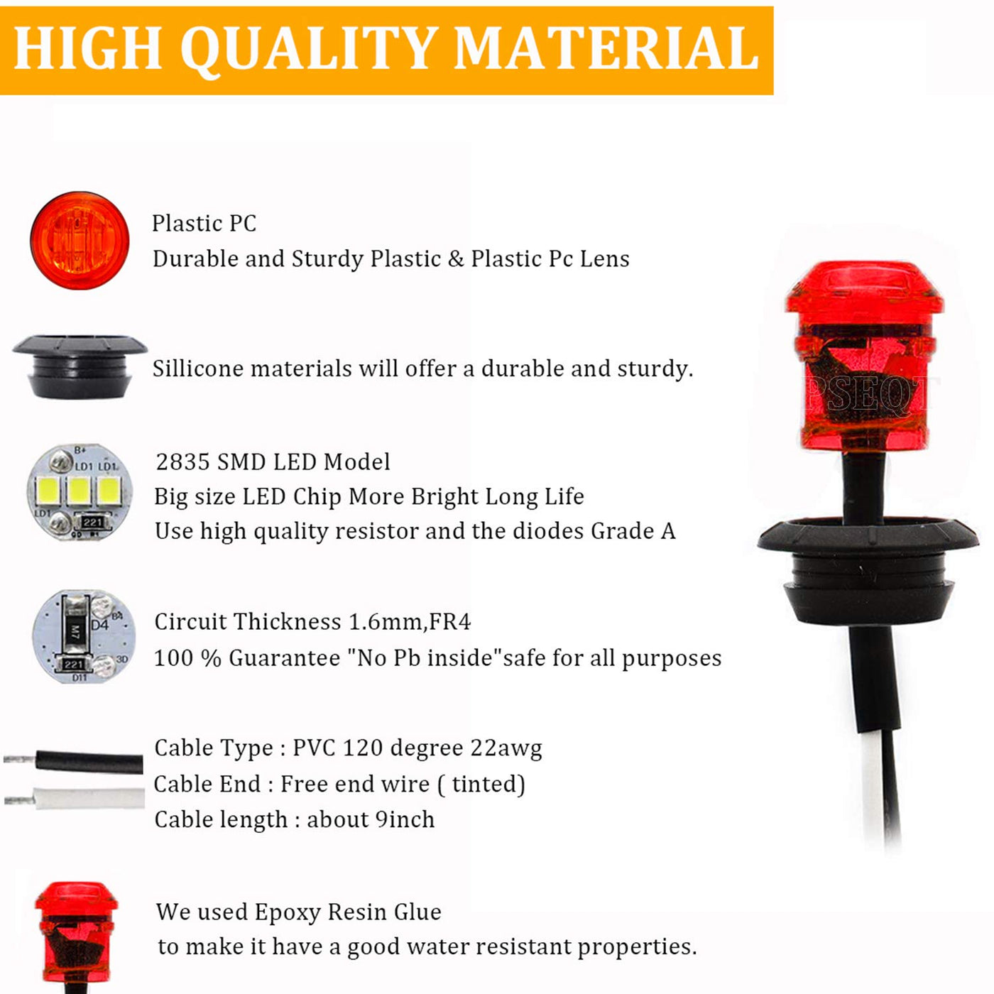 - Q: How do I install the PSEQT LED Rock Lights? A: Installation is straightforward: drill a 0.75" hole for the mounting, connect the two wires (Black for Positive and White for Negative), and insert the light into the rubber grommet. The no-screw sealing design ensures a secure fit.