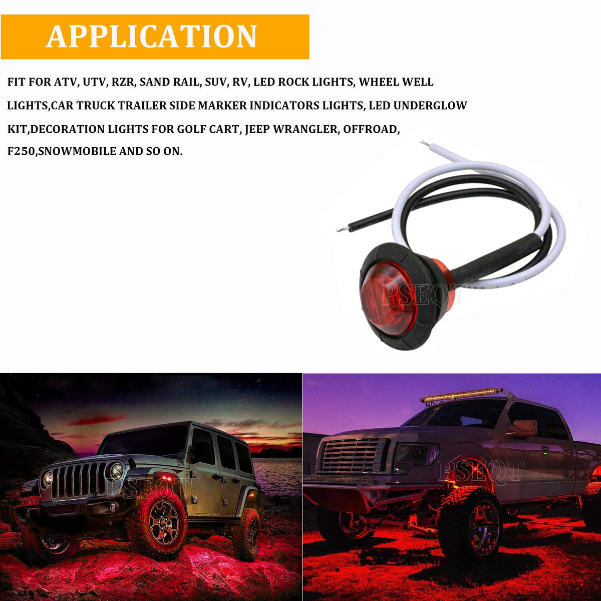 - Q: Can I use these lights for purposes other than underglow lighting? A: Absolutely! The PSEQT LED Rock Lights can be used for various applications, including as side marker lights, clearance lights, tail lights, running lights, and even automotive neon accent lights.