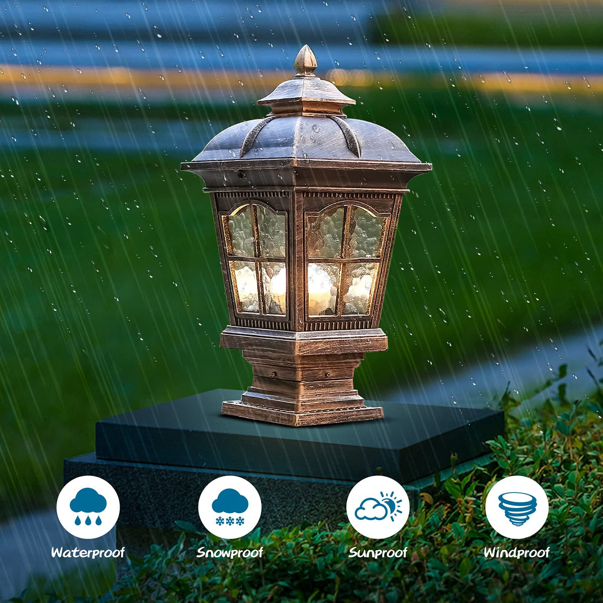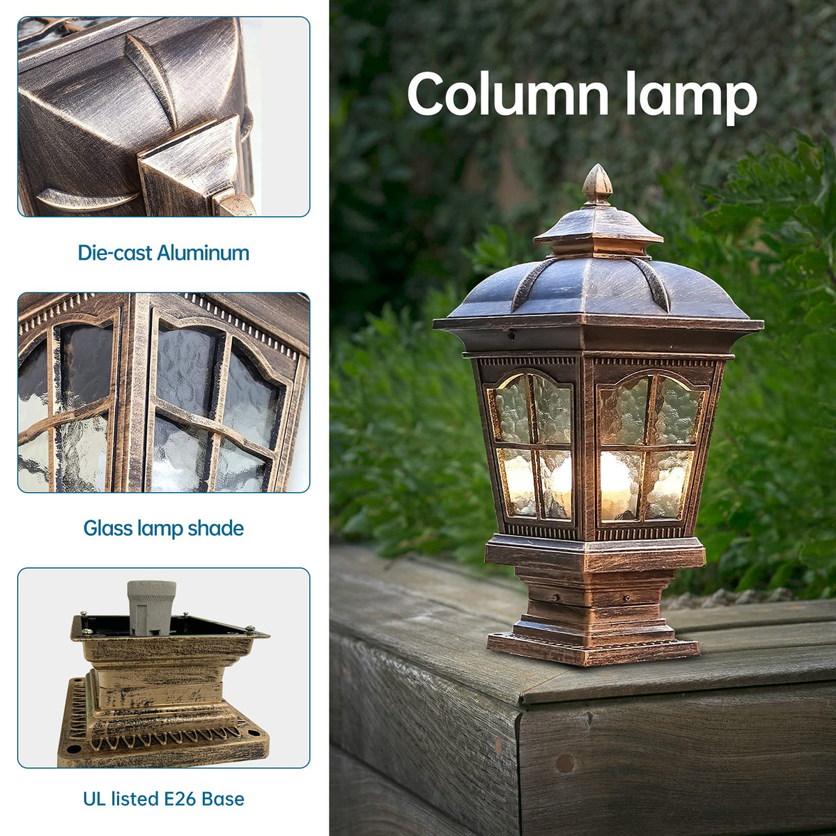 SPECIFFICATIONS: [Brand name]: PTOUG [Product Type]: Outdoor waterproof column lamp/External pillar light/post lamp/garden post lantern/pillar column light/courtyard lantern [Style]: European retro [Main material]: aluminum, glass [Features]: waterproof, anti-rust, high temperature resistance. [Size]: You can refer to the size table [Height]: 45cm(17.7inch) [Width]: 23cm(9.05inch) [Base diameter]: 15.6cm(6.14inch) [Irradiation area]: 10-20 square meters [Applicable rooms]: outdoor, garden, front door, fence, stairs, path, passage, door, driveway, balcony, aisle, living room, hotel, etc.