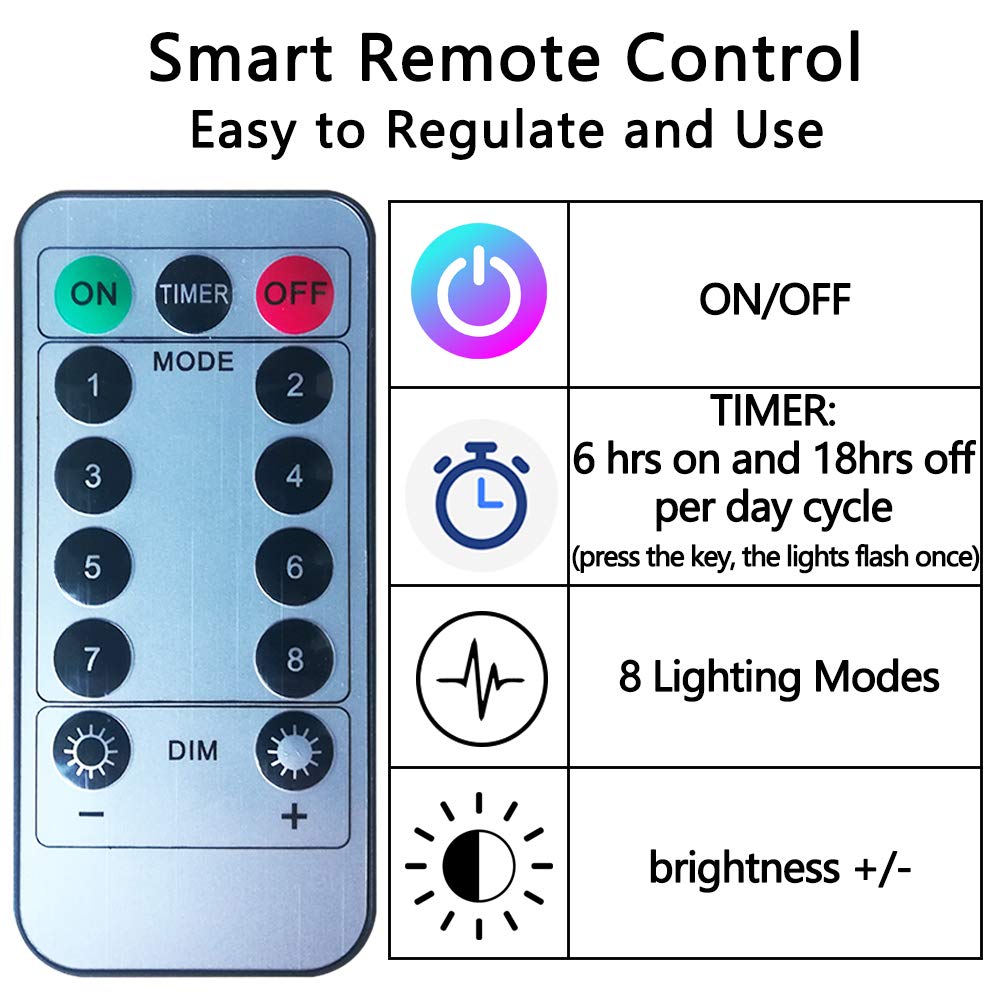 --It comes with 104 high quality LED lights and 8 strings. Each string is 51.2inch(130cm) with 13 LED lights. 8 different lighting modes, high brightness, good stability, strong ductility and long service time. --It is battery powered. 3 * AA batteries(not included) 4.5V Powered is safer, more stable and more convenient than solar powered. --Multi-function remote control is very convenient. Set work time, choose lighting mode, adjust light brightness, turn on/off. --It is IP68 waterproof and dustproof, it is fully protected from dust and water. So it is suitable for work both indoor, outdoor and varieties of weather, including rain. --It is easy to install on umbrellas and tents, perfect for patio park garden yard cafe coffee shop beach and other outdoor places, make a good comfortable great atmosphere, meet your various activity,such as BBQ, Playing cards, outdoor party, camping etc.