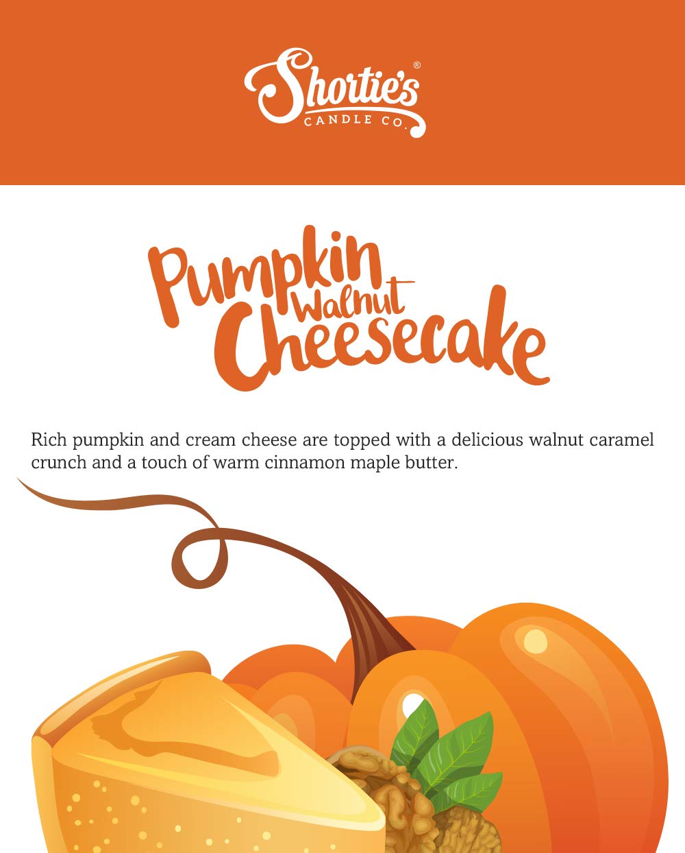 Rich pumpkin and cream cheese are spiced just right then topped with a delicious walnut caramel crunch and a touch of warm cinnamon maple butter. Our Pumpkin Walnut Cheesecake tealight candles feature a beautiful clear container that allows the candle color to shine through brilliantly, and a self trimming natural fiber wick. Our Pumpkin Walnut Cheesecake tea lights will add a luminous splash of color to any home decor, or any event big or small! Each 1/2 Oz. tealight burns for 5+ hours, and pack a great scent throw for such a small package. Our classic container wax is composed of a super soft paraffin petrolatum blend with a low melt point making for strong fragrance fast.