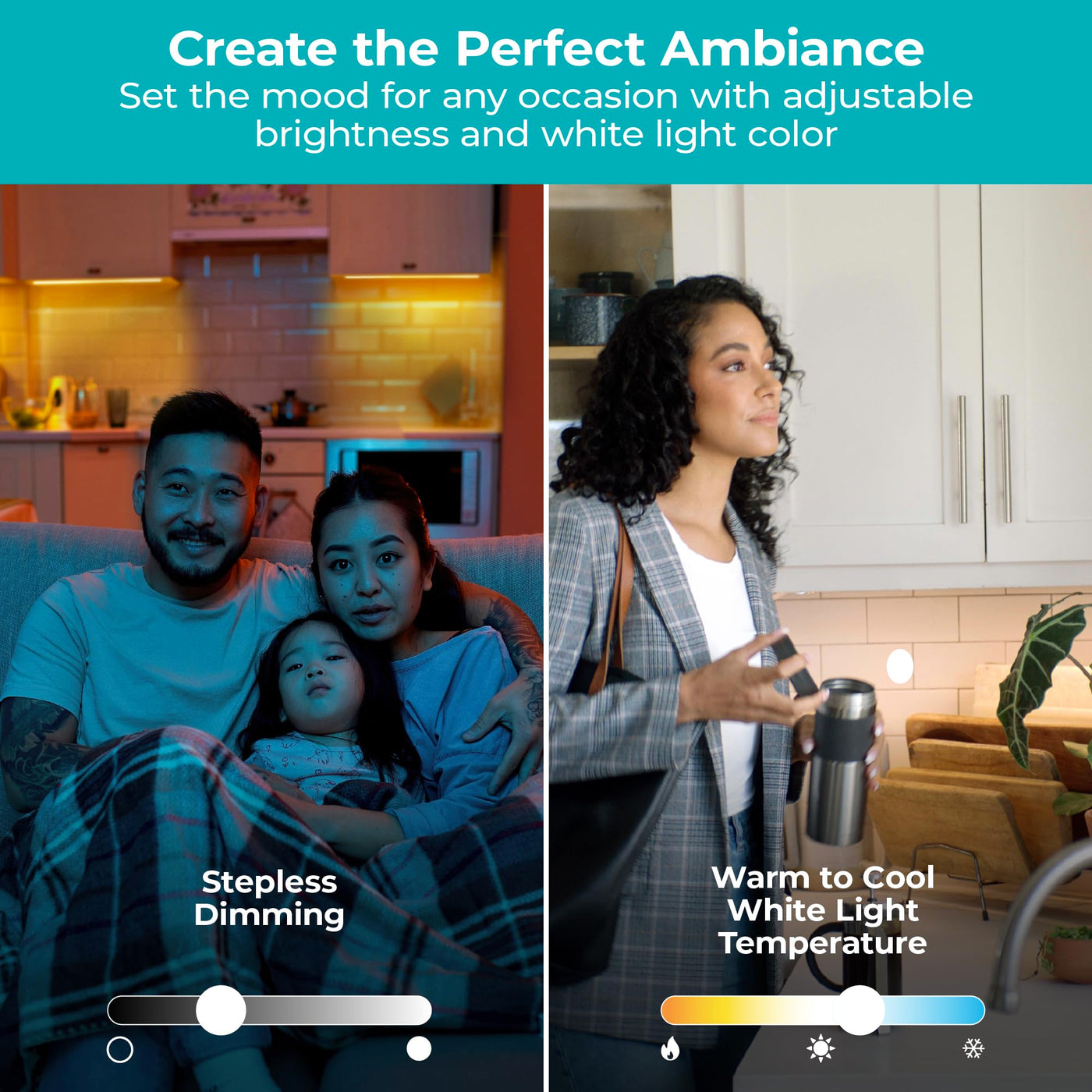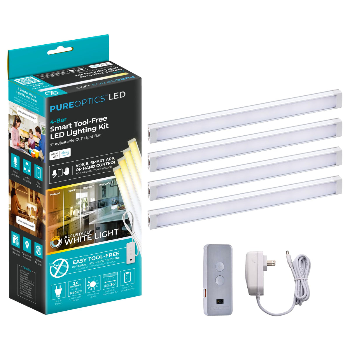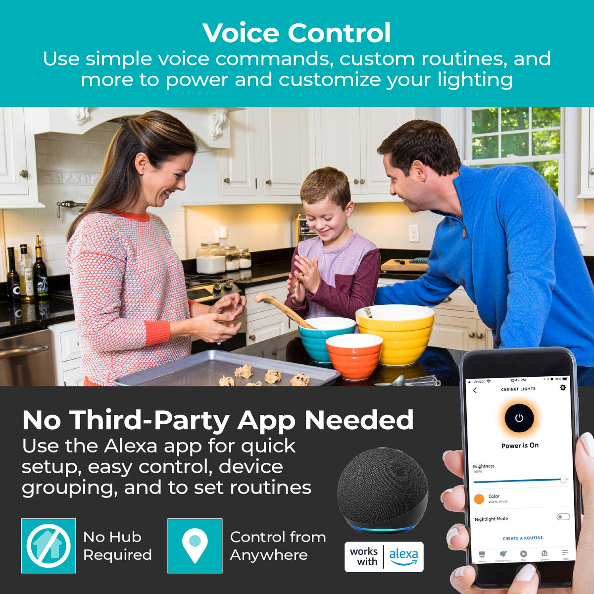Light up your kitchen with the simple tap of an app or voice command. Create a lighting and ambient experience unlike any other with our under cabinet lighting thats compatible with Alexa devices; making it a device with no third-party app required. Whether youre in the living room and want to turn the lights on in your kitchen without getting up from the couch, or youre on your way home from work and want to walk in to a lit-up house, you can virtually turn your under cabinet lights on from anywhere. Dim the lights or set a routine with the app or voice control without leaving your bed. The best part? You can even pair these lights with other smart devices in your kitchen, closet, garage, workshop or anywhere in your home, for easy lighting control in any area of your house! This 4-pack of 9 ultra-thin light bars illuminate a wide, flicker-free zone that can be changed from full brightness with soft white, white or daylight white to night mode in a matter of seconds. Worried about installation? This voice-activated smart LED lighting solution can be easily installed in a matter of minutes with no stress, no tools and no confusion for frustration-free installation. You can even turn the lights on and off by waving your hand under the motion sensor for touch-free activation that leaves your lights bright and your kitchen clean.