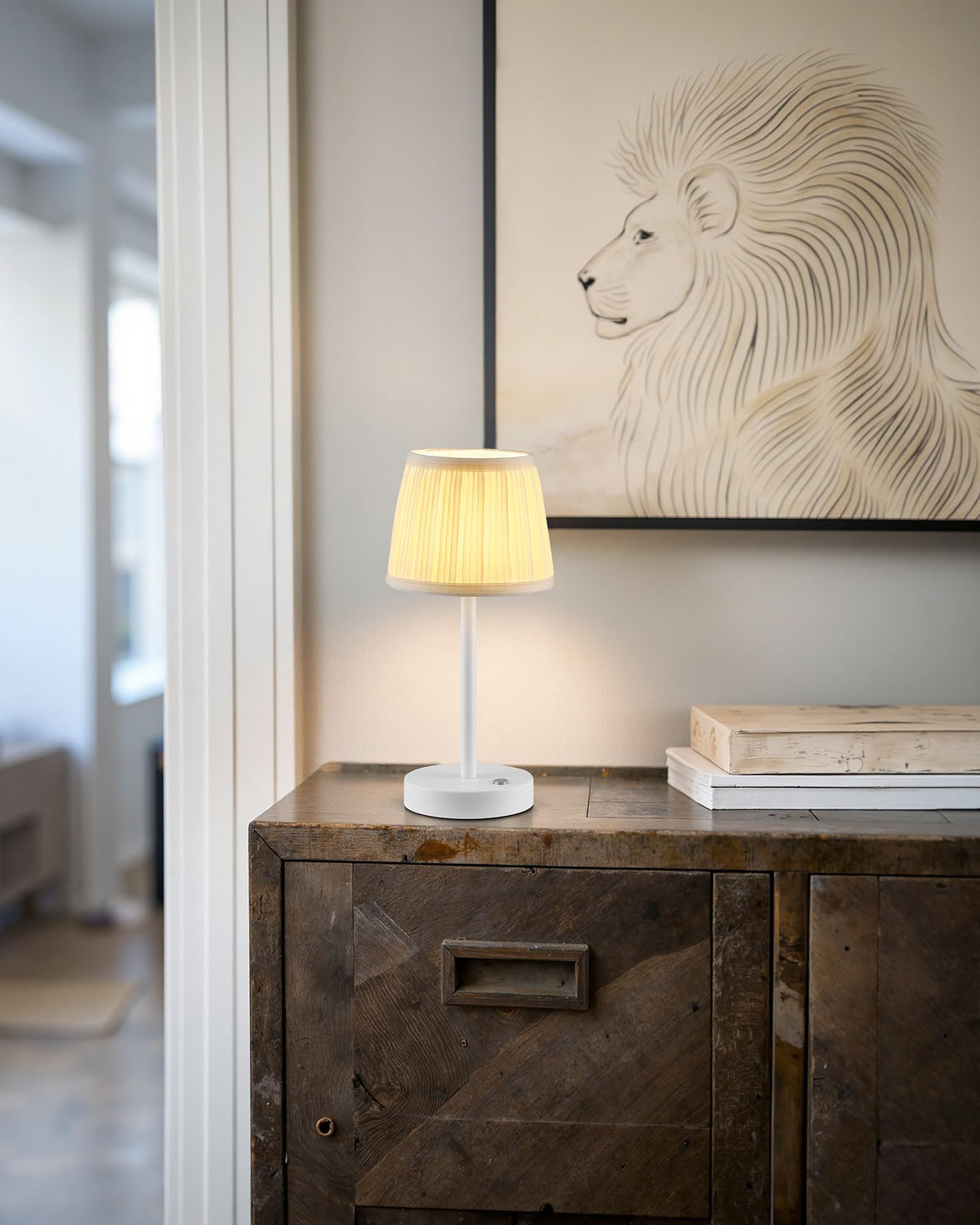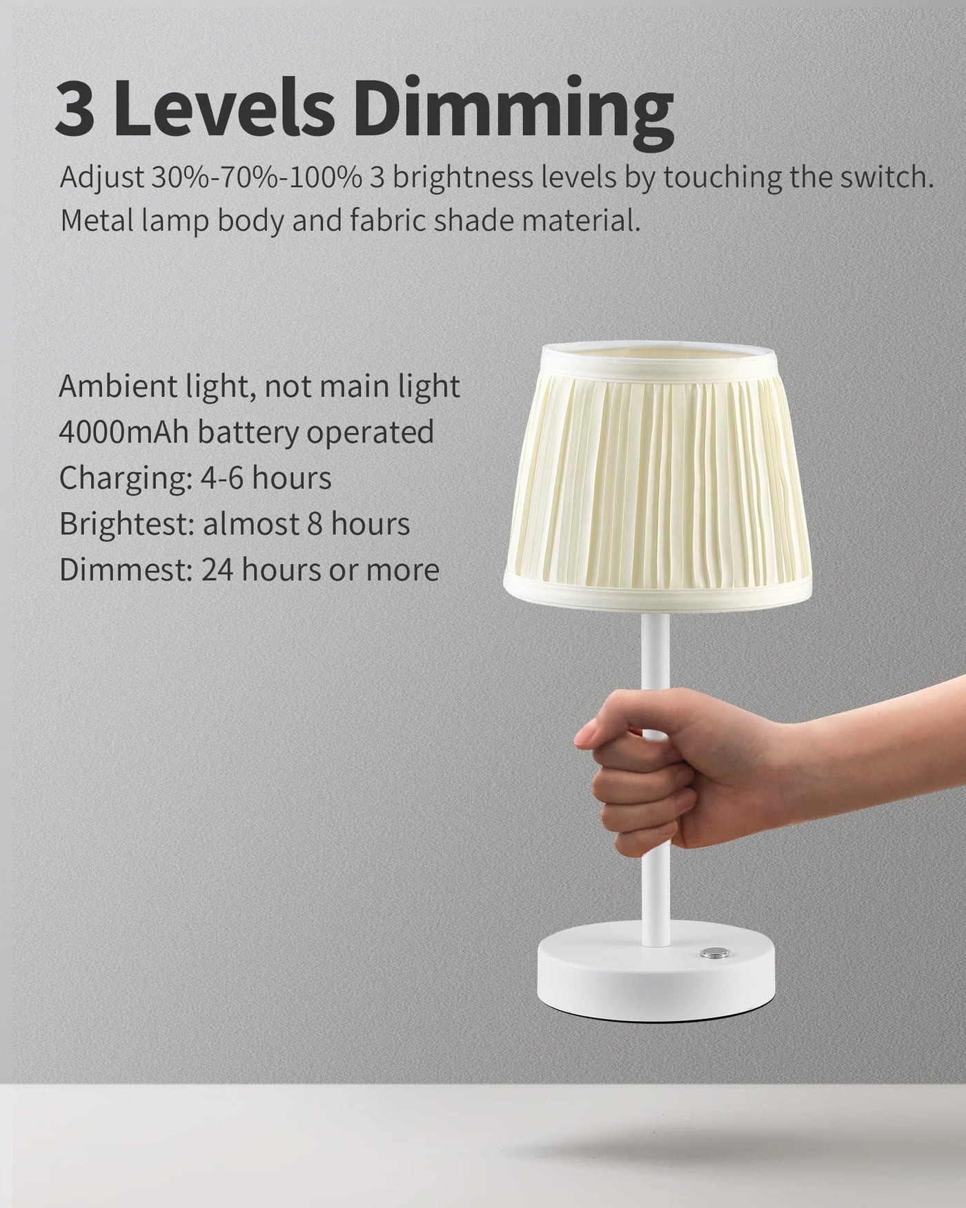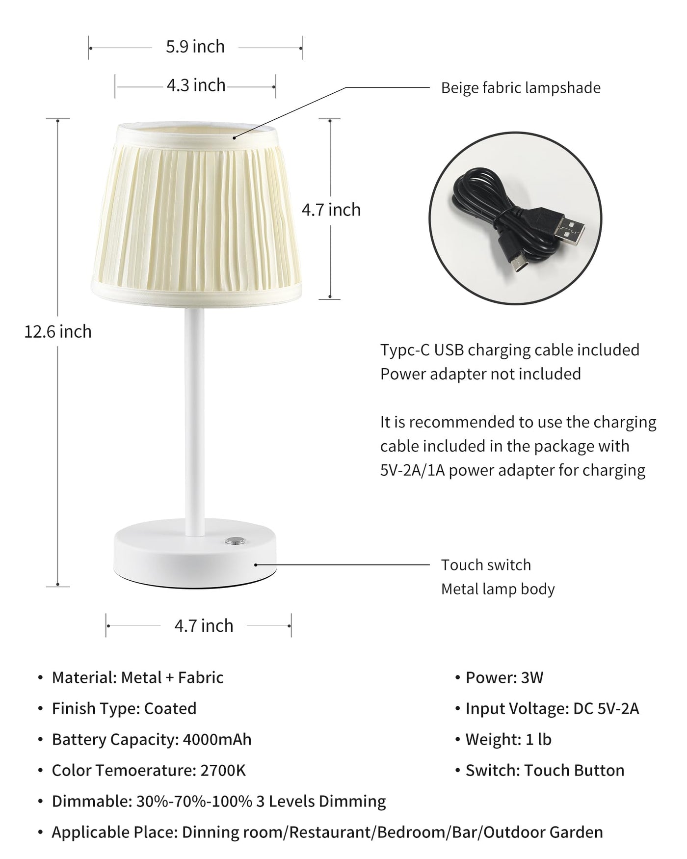 Modern Wireless Desk Lamp With 4000Mah Rechargeable Battery And Three-Level Dimming. This Lamp Blends Cutting-Edge Functionality With Minimalist Design Featuring A Built-In 4000Mah Rechargeable Battery That Fully Charges In 4-6 Hours Via The Included Usb Cable (5V/1A Adapter Sold Separately). Its Cordless Design Eliminates Cable Clutter For Unparalleled Portability-Weighing Just 1 Lb (Approx. 0.45 Kg) With Compact Dimensions Of 12.6 Inches Tall ? 5.9 Inches Wide It Effortlessly Fits Desks Nightstands Outdoor Patios Or Travel Luggage. Three Touch-Controlled Brightness Modes Cater To Personalized Needs: High Brightness Mode (8-Hour Runtime) For Focused Work Medium Brightness Mode For Comfortable Reading And Low Brightness Mode (24-Hour Runtime) For Creating A Relaxing Nighttime Ambiance Or Emergency Lighting. The 2700K Warm White Led Array Simulates Natural Daylight Effectively Reducing Eye Strain. Paired With A Soft Linen-Textured Shade It Eliminates Harsh Glare While Ensuring Even Light Diffusion. The Durable Metal Base Offers Three Finishes-Brushed Nickel Matte Black Or Matte White-Seamlessly Integrating Into Modern Rustic Or Scandinavian Decor. Energy-Efficient Led Bulbs Last Over 50 000 Hours (Equivalent To 15+ Years At 8 Hours Daily) Making It A Sustainable Choice For Home Offices Dorm Rooms Or Gifts.