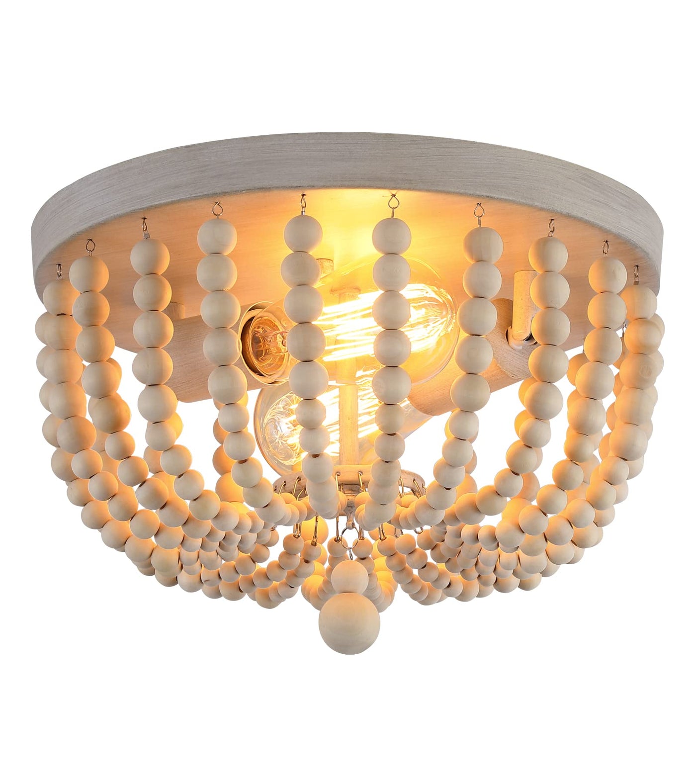 Q&S Boho Chandelier Wood Beaded Flush Mount Ceiling Light Fixtures For Nursery Baby Bedroom Kitchen Hallway,Oak White Finish,2-L