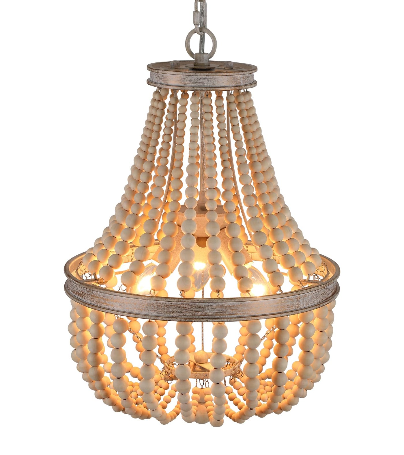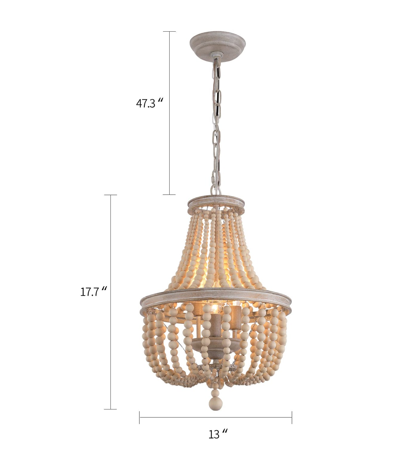 Q&S Wood Beaded Chandelier, 3-Lights Rustic Farmhouse Pendant Light For Nursery & Dining Room