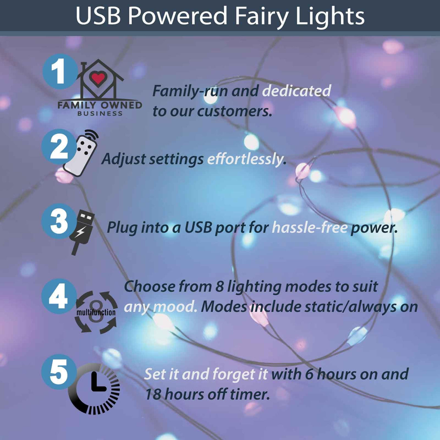USB plug in Fairy Lights are the perfect Christmas decoration for your home. Control the string lights easily and set the ambience to suit your mood.... select the mode and brightness. The USB fairy lights can be used all year. Add some shine to your PC and home office, decorate a kids bedroom and use the timer mode. Decorate your ornaments, picture frames, headboard or TV.
