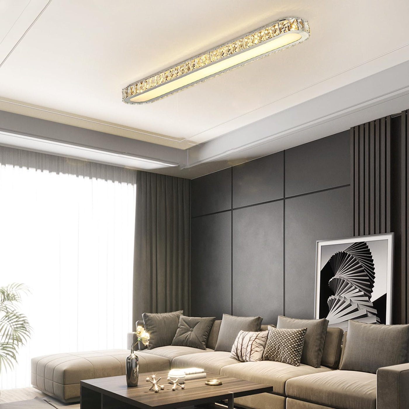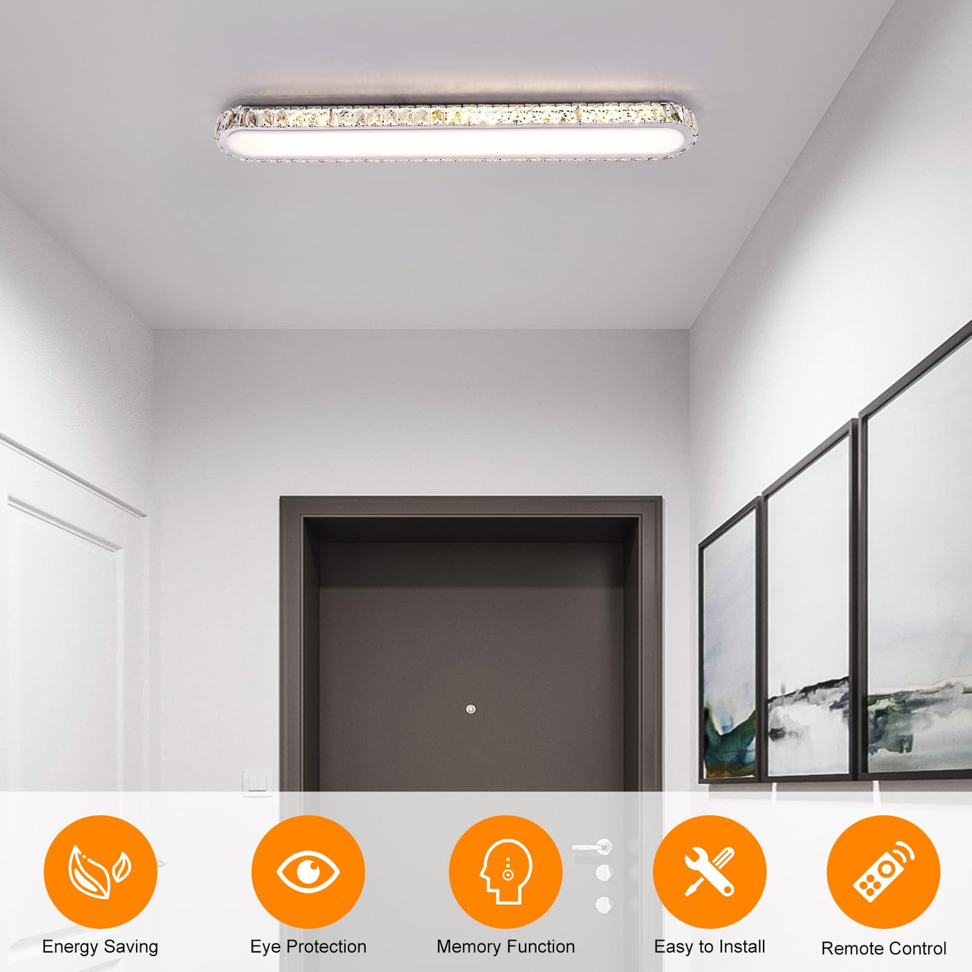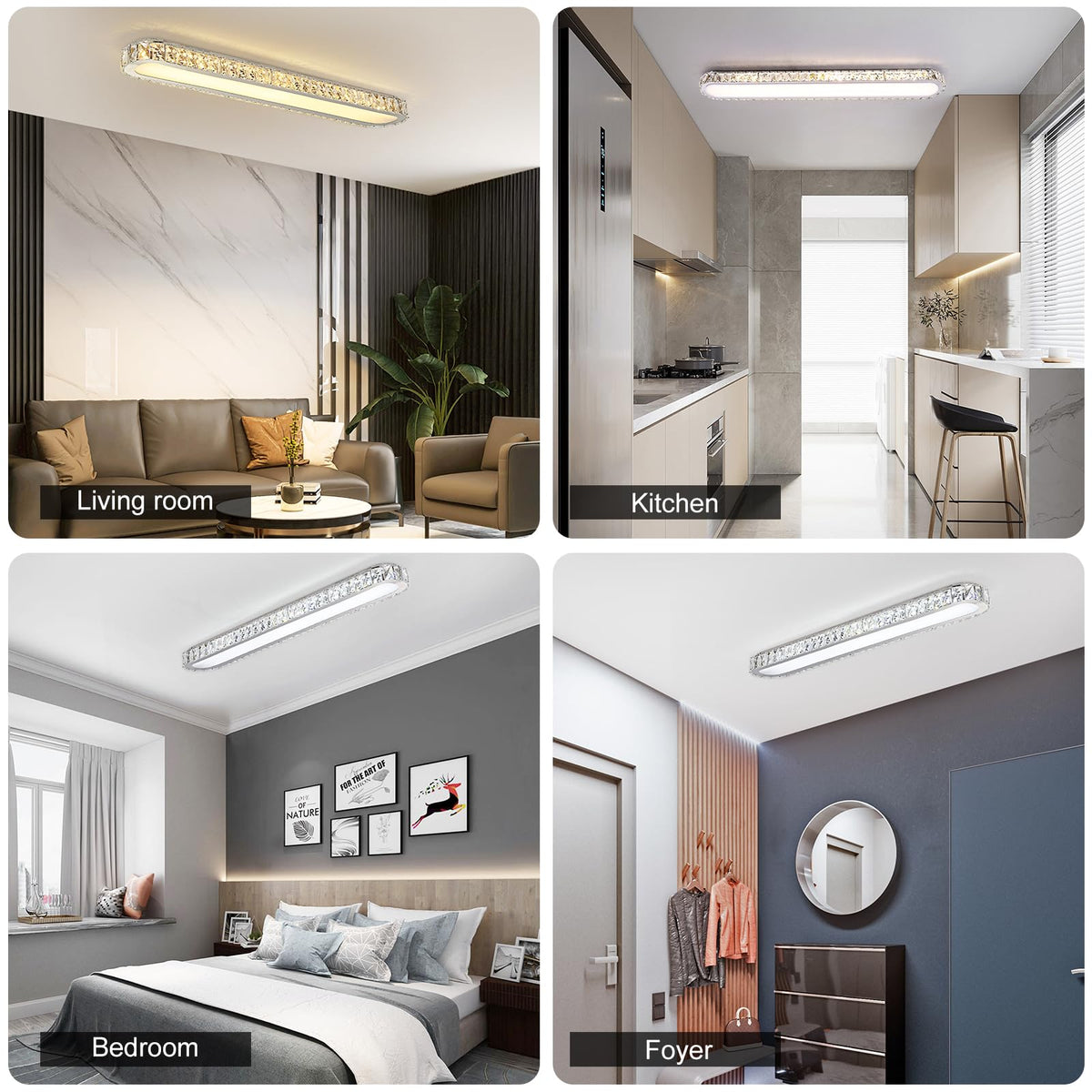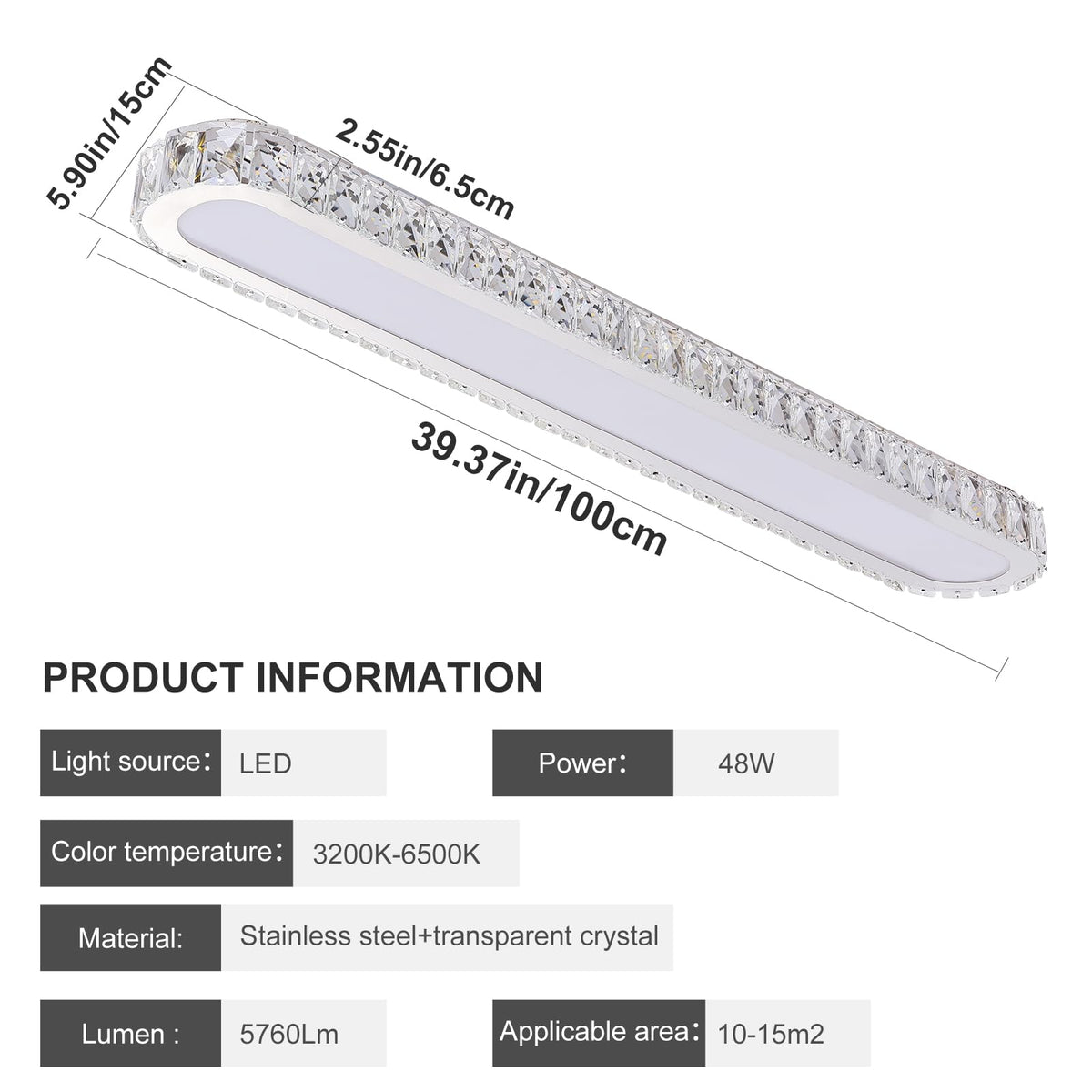Specification: Material: Stainless Steel And Crystal Lamp Shape: Linear/Long Strip Lamp Body Color: Chrome And Crystal Dimensions: 39.4(L)X5.9(W)X2.5(H) Power: 48W/5760Lm Type Of Bulb: Led Light Source(Bulbs Are Included) Setting: Flush Mount Ceiling High Performance Kitchen Ceiling Light Is Perfect For Illuminating Larger Spaces. This Flush Mount Chandelier Is Powered By well-made Led Beads Which Is Energy-Efficient And Has A Long Lifespan Making It A Cost-Effective Lighting Solution For Your Home Or Office. Remote Control The Long Flush Mount Ceiling Light With Remote Control Can Adjust Brightness Color Temperature Timing Function Night Light Mode Convenient And Fast. Ceiling Chandelier Has A Memory Function. Widely Used Modern Crystal Ceiling Light Is Ideal For Your Bedroom Kitchen Dining Room Bathroom Living Room Hallway Laundry Office Porch. Great Kitchen Light And Rectangle Chandelier For Your Home. Easy To Install Hallway Light Fixtures Is Easy To Install.We Provide Comprehensive User Manual And You Can Scan The Qr Code To Watch The Installation Video In The Manual.If You Have Any Problems With Installation And Use Please Contact Us Via Message We Are Willing To Help. Package Included: 1* Led Ceiling Light 1* Remote Control 1*Instruction Manual Other Gadgets