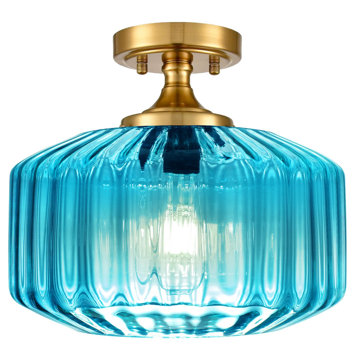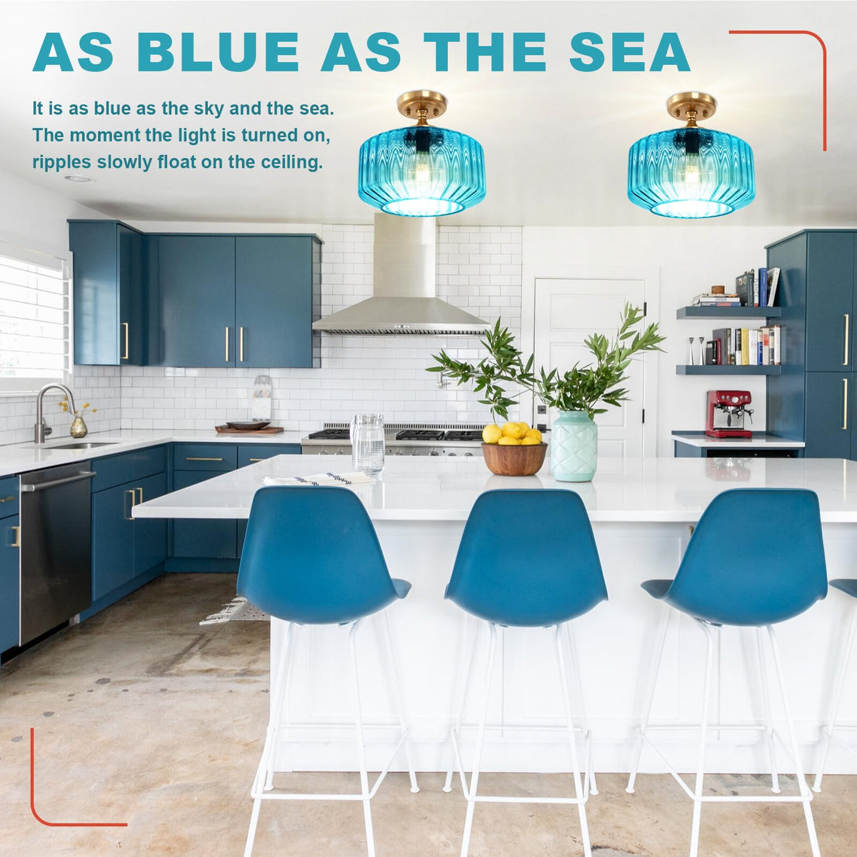 Qepeety Blue Glass Flush Mount Ceiling Light 11.02 Vintage Gold Chandelier Hallway Lights Fixture Modern Close To Ceiling Lighting For Bathroom Bedroom Compatible With E26 Bulb (Bulb Not Included)
