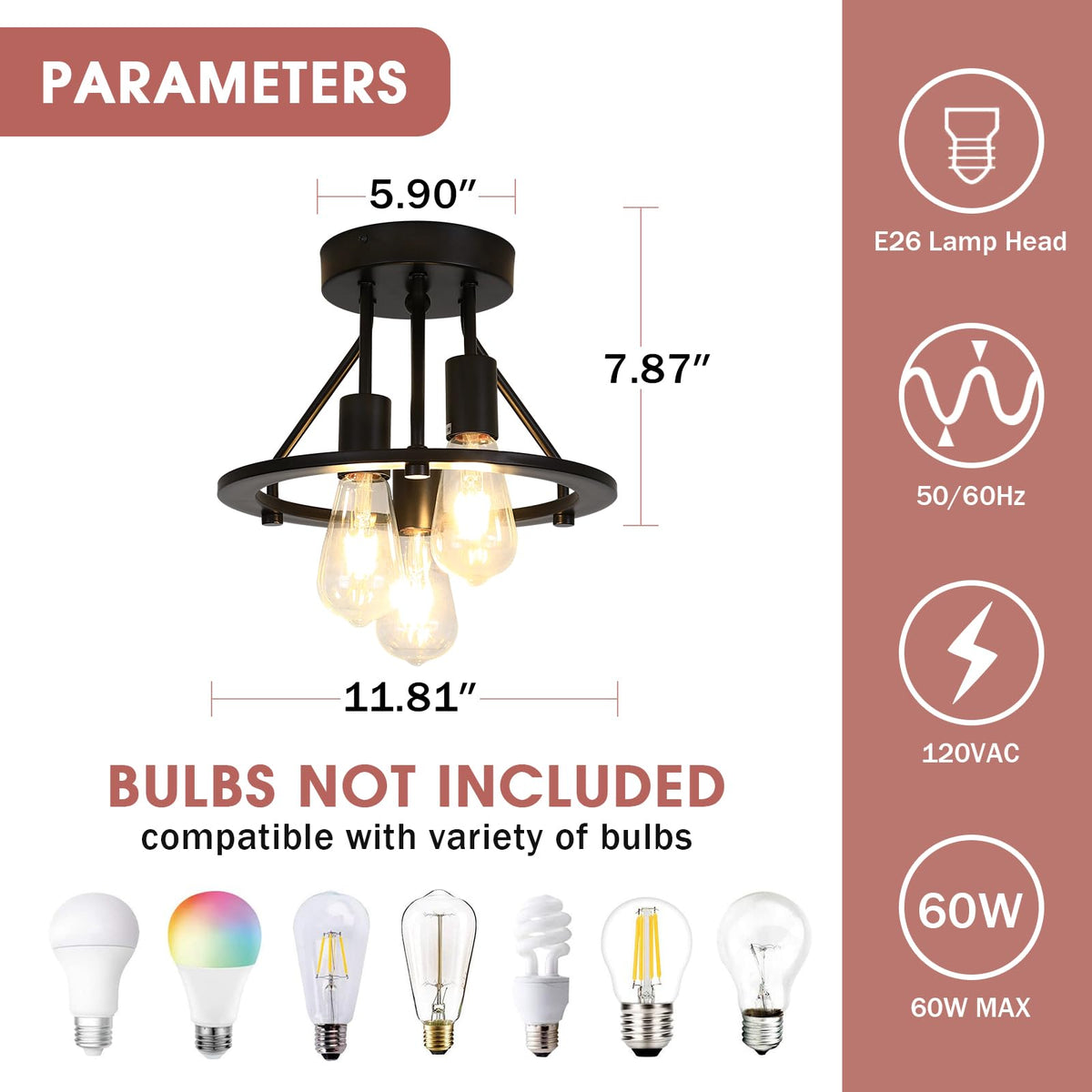 Qgiytp Semi Flush Mount Ceiling Light Fixture 3-Light Matte Black Ceiling Light E26 Edison Farmhouse Industrial Small Chandelier