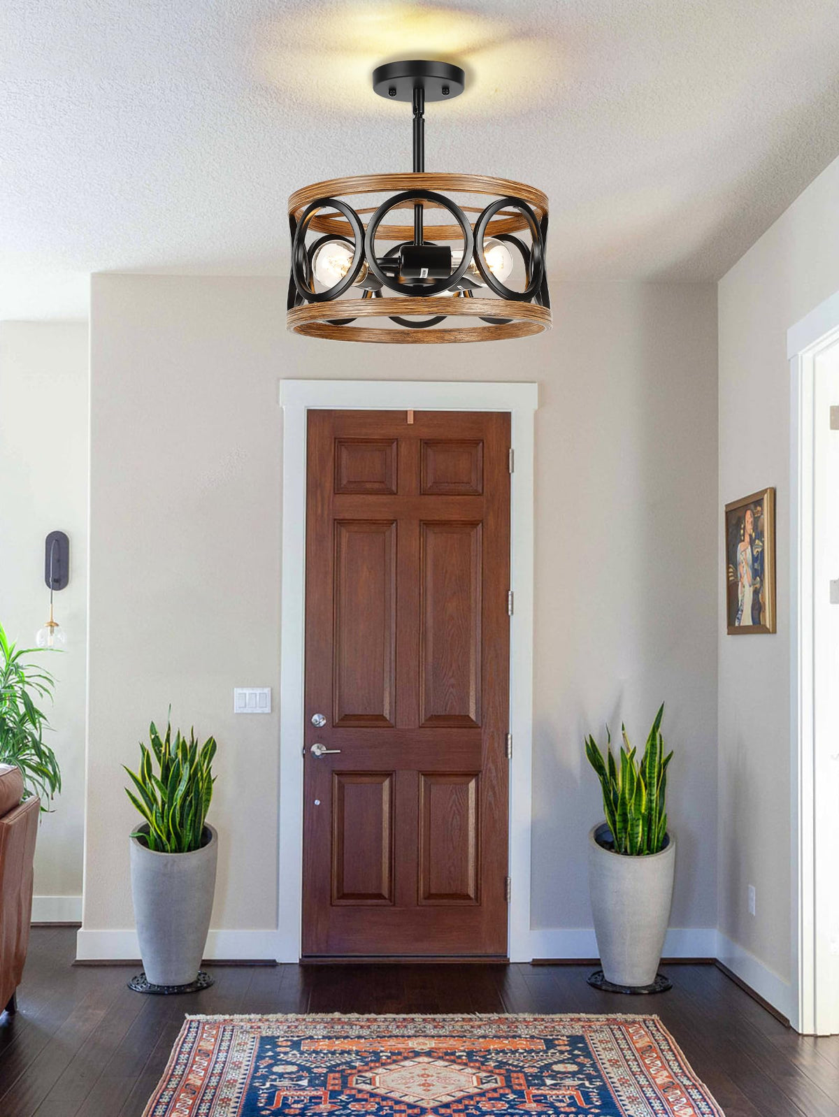 Q: What style does the QianZhan ceiling light feature?A: The QianZhan Farmhouse Semi Flush Mount Ceiling Light features a modern farmhouse style, combining circles with black and bronze finishes, adding sophistication to your hallway, kitchen, or bedroom.