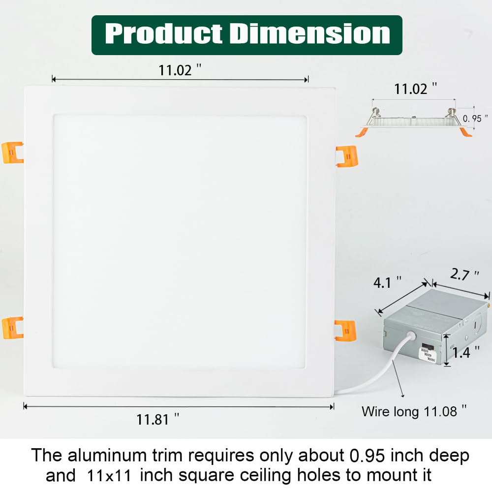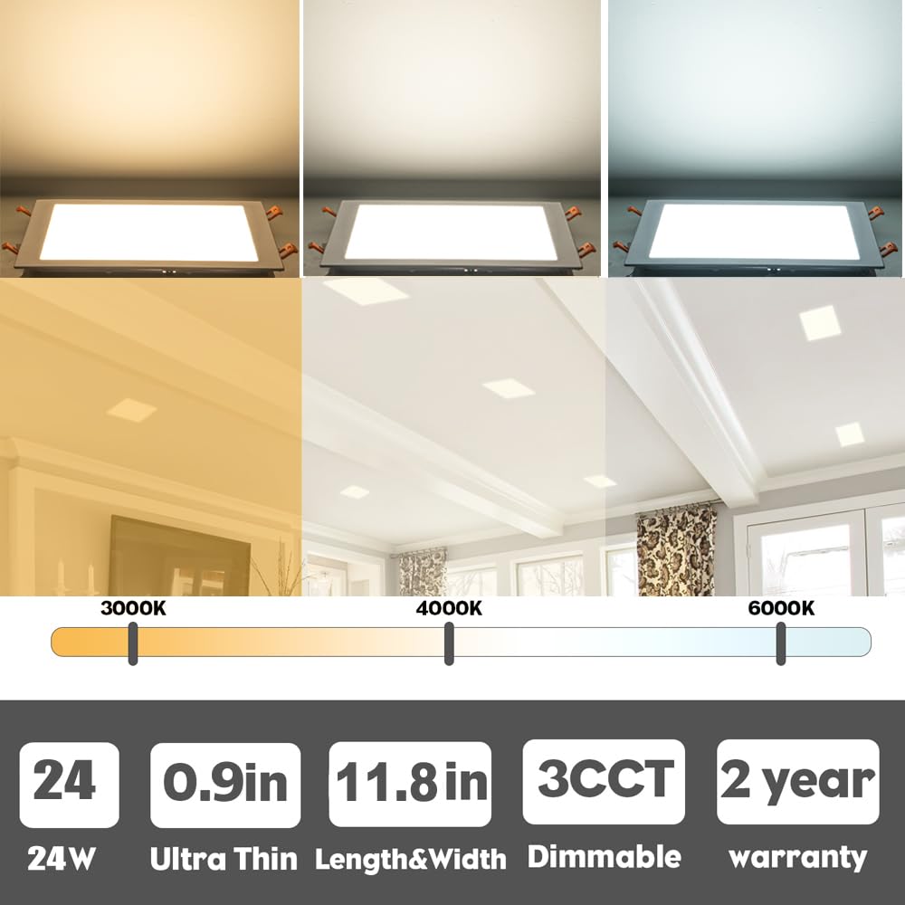 3Cct Ultra Thin Square Led Recessed Lighting 11Inch Dimmable With Junction Box. Are You Looking For A Downlight For Your Home Lighting But Not Sure What Color To Pick? Are You Tired Of Old-Version Recessed Lighting That Required A Can Housing? Are You Worried About Your Ceiling Space Is Not Large Enough To Install? Don'T Worry, Qibang Ultra-Thin Led Recessed Lighting Is Just What You Need To Take All The Hassles Away!! Ultra-Thin Led Recessed Light Fixtures 2160Lm High Brightness 3 Color Temperature Selectable No Flickering, Flashing, And Humming Noise Wattage: 24W. 3 Color In One: 3000K Warm White, 4000K Natural White, 6000K Daylight Luminous Flux: 2160Lm5% Cri >90 Ip Rating: Ip20 Dimmable: 5%-100% Dimming Input Voltage: Ac110V-120V Material: Aluminum Dimension: 11.82'' X 11.82'' X 0.9'' 1.Turn Off The Home Power First. 2.Cut A Appropriate Hole On Ceiling According To Product Cut-Hole Size. 3.Connect The Led Transformer To The Power Supply. 4.Pull Up The Spring Clips And Insert The Light Fixture To The Hole. 5.Adjust It To Hook The Ceiling Tightly.