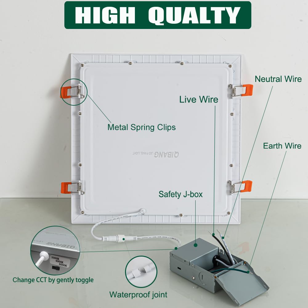 3Cct Ultra Thin Square Led Recessed Lighting 11Inch Dimmable With Junction Box. Are You Looking For A Downlight For Your Home Lighting But Not Sure What Color To Pick? Are You Tired Of Old-Version Recessed Lighting That Required A Can Housing? Are You Worried About Your Ceiling Space Is Not Large Enough To Install? Don'T Worry, Qibang Ultra-Thin Led Recessed Lighting Is Just What You Need To Take All The Hassles Away!! Ultra-Thin Led Recessed Light Fixtures 2160Lm High Brightness 3 Color Temperature Selectable No Flickering, Flashing, And Humming Noise Wattage: 24W. 3 Color In One: 3000K Warm White, 4000K Natural White, 6000K Daylight Luminous Flux: 2160Lm5% Cri >90 Ip Rating: Ip20 Dimmable: 5%-100% Dimming Input Voltage: Ac110V-120V Material: Aluminum Dimension: 11.82'' X 11.82'' X 0.9'' 1.Turn Off The Home Power First. 2.Cut A Appropriate Hole On Ceiling According To Product Cut-Hole Size. 3.Connect The Led Transformer To The Power Supply. 4.Pull Up The Spring Clips And Insert The Light Fixture To The Hole. 5.Adjust It To Hook The Ceiling Tightly.