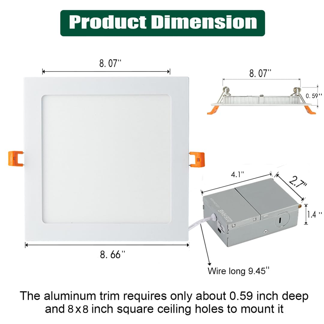 3CCT 8 inch ultra-thin square recessed lighting with Junction Box. Are you looking for a downlight for your home lighting but not sure what color to pick? Are you tired of old-version recessed lighting that required a can housing? Are you worried about your ceiling space is not large enough to install? Don't worry, QIBANG Ultra-Thin led Recessed Lights is just what you need to take all the hassles away!! Ultra-thin LED Recessed Lighting Fixtures 1600LM High Brightness Three Color Temperature Selectable No flickering, flashing, and humming noise Wattage: 18W. 3 Color in one: 3000K Warm White, 4000K Natural White, 6000K Daylight Luminous Flux: 1600Lm5% CRI >90 IP Rating: IP20 Dimmable: 5%-100% Dimming Input Voltage: AC110V-120V Material: Aluminum Dimension: 8.66'' x 8.66'' x 0.59'' 1.Turn off the home power first. 2.Cut a appropriate hole on ceiling according to product cut-hole size. 3.Connect the led transformer to the power supply. 4.Pull up the spring clips and insert the light fixture to the hole. 5.Adjust it to hook the ceiling tightly.