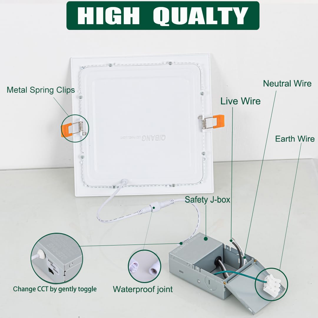 Qibang Square Led Recessed Light 8 Inch Dimmable With Junction Box,3Cct 3000K/4000K/6000K Selectable,1600Lm Cri90+18W Ultra-Thin