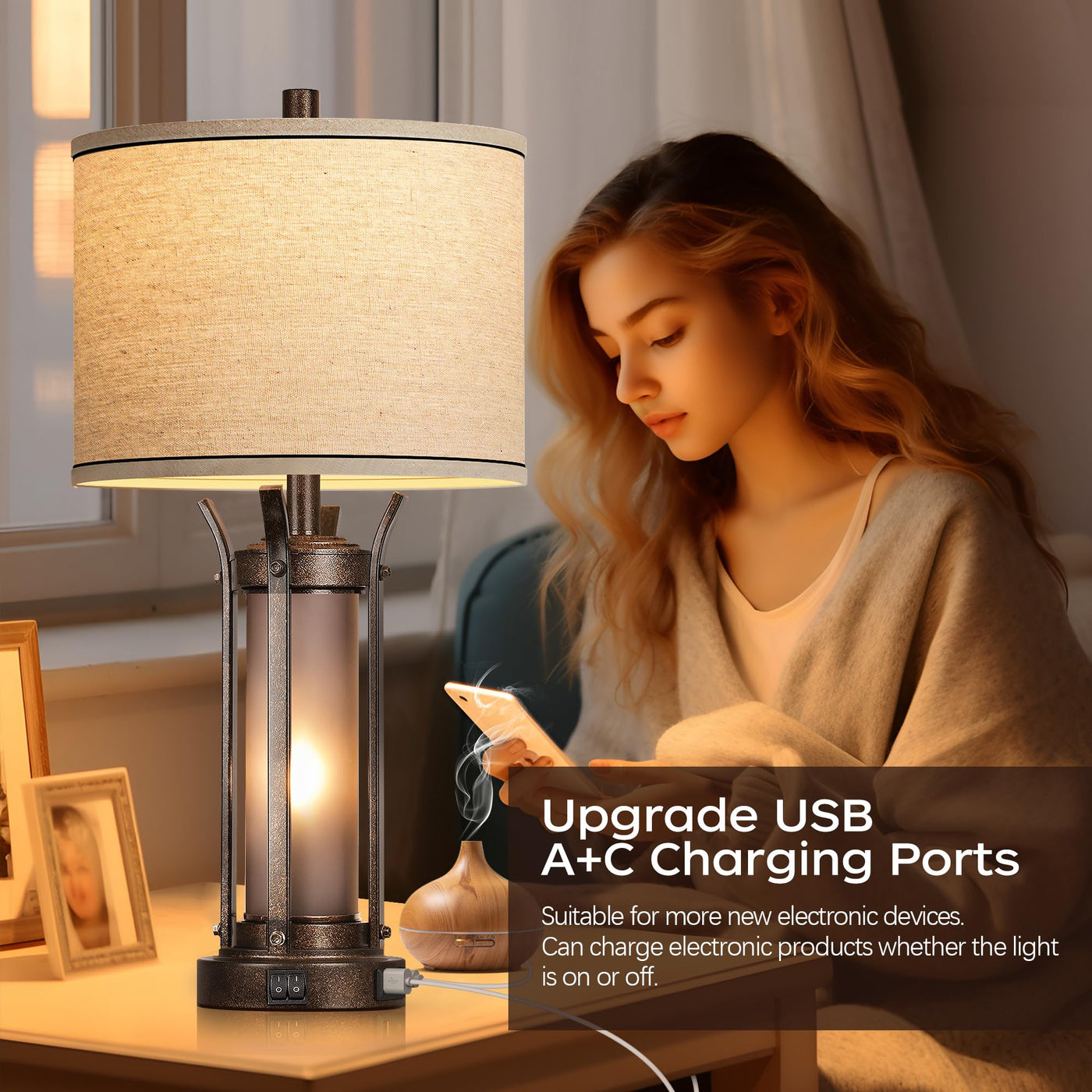 Qimh Farmhouse Table Lamps For Living Room, Rustic Beside Lamps For Bedroom With Usb A+C Charging Ports, Nightstand Lamp With Fr