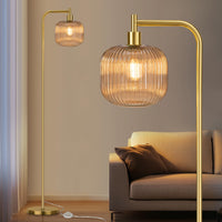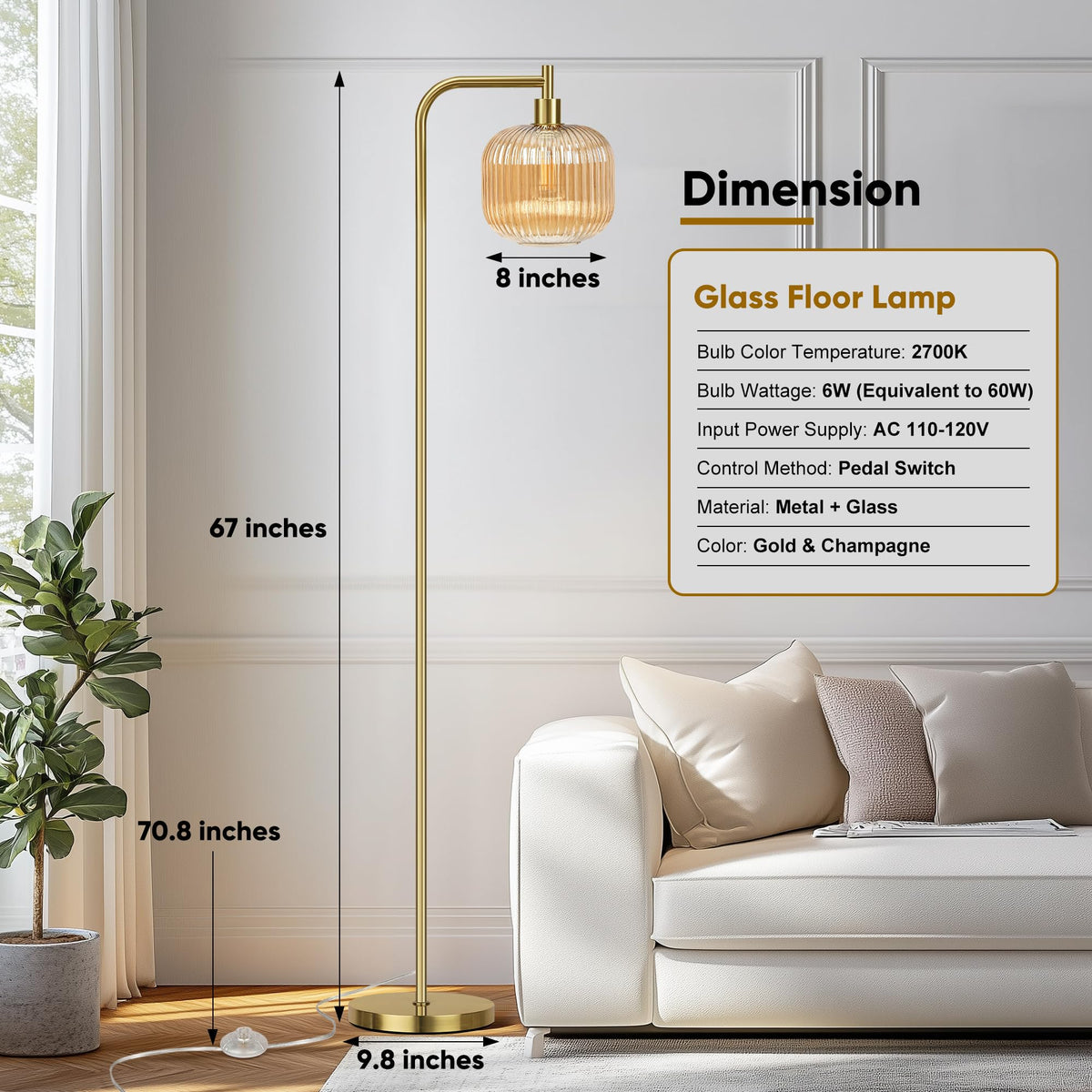 Qimh Glass Floor Lamp For Living Room, Modern Standing Lamp With Ribbed Champagne Glass Lampshade Pedal Switch, 67 Tall Lamp
