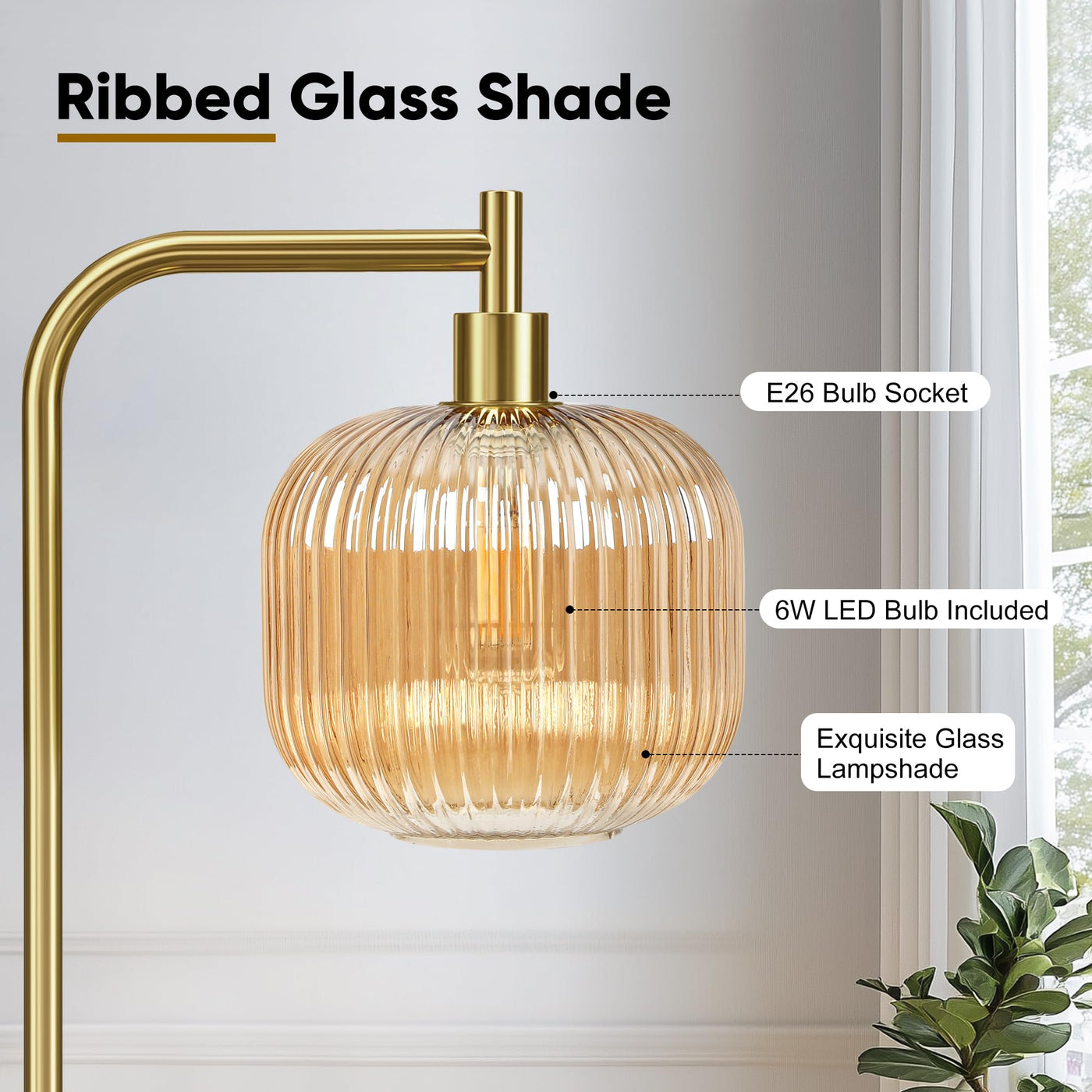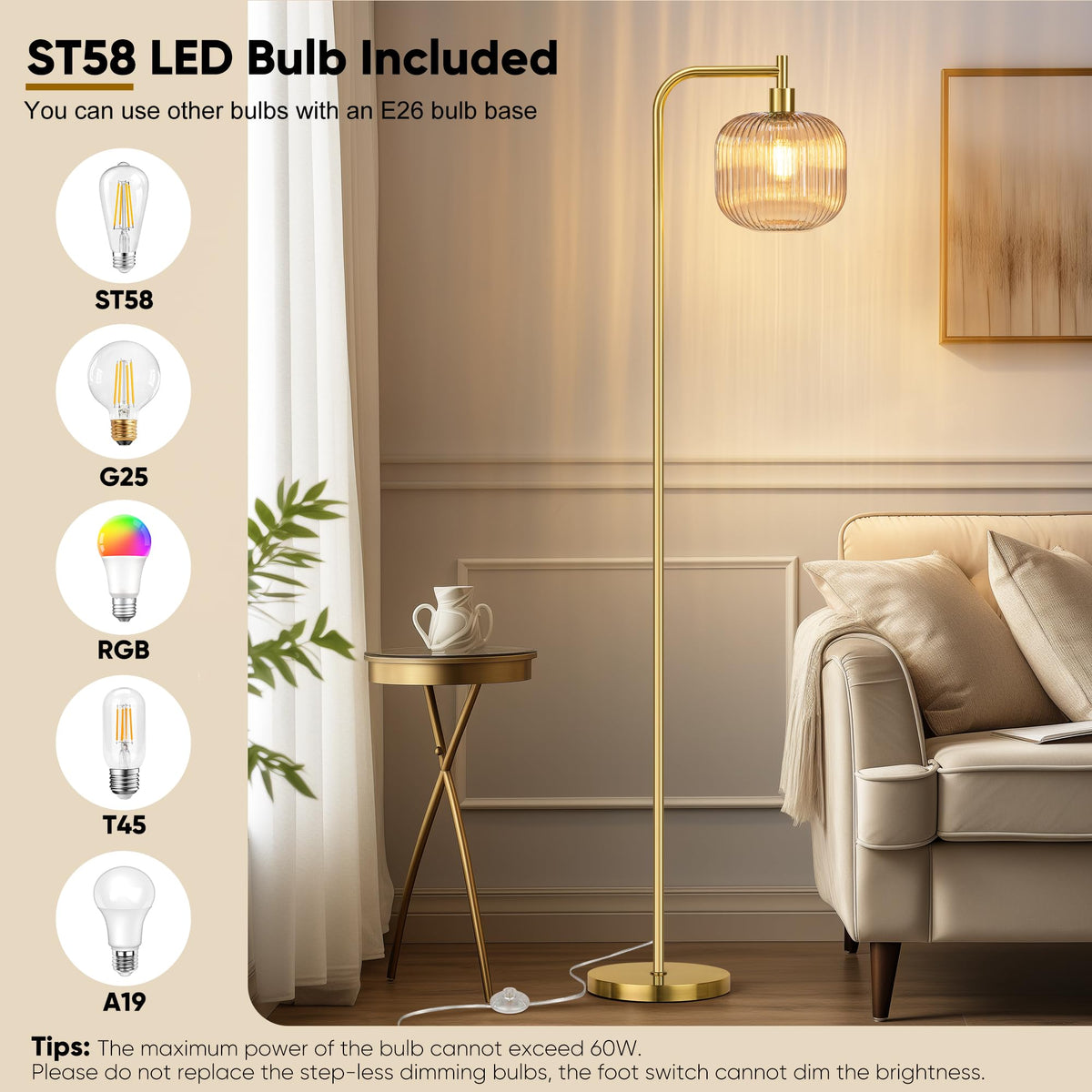 This 67'' high glass shade floor lamp will make a standout addition to the lighting in any space in your home. Showcasing a gold-tone metal base, a long candlestick stem, and a ribbed glass shade, the lamp exudes grace style. The lamp equipment is an E26 LED bulb. Best of all, the 70.8-inch cord with a foot switch allows fuss-free placement and easy operation anywhere.