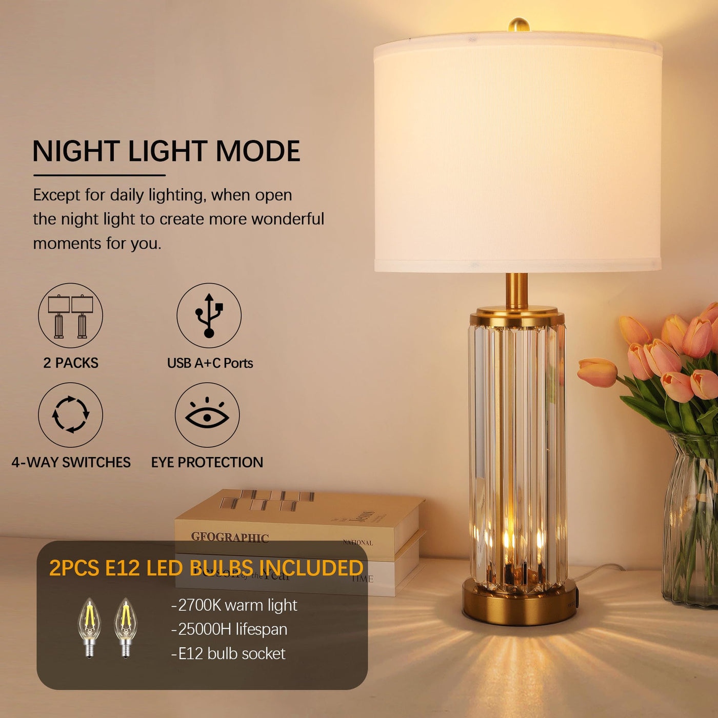 Qimh Gold Table Lamps For Bedroom Set Of 2 With Nightlight, Modern Bedside Lamp With 2 Usb A+C Charging Port, Clear Nightstand L