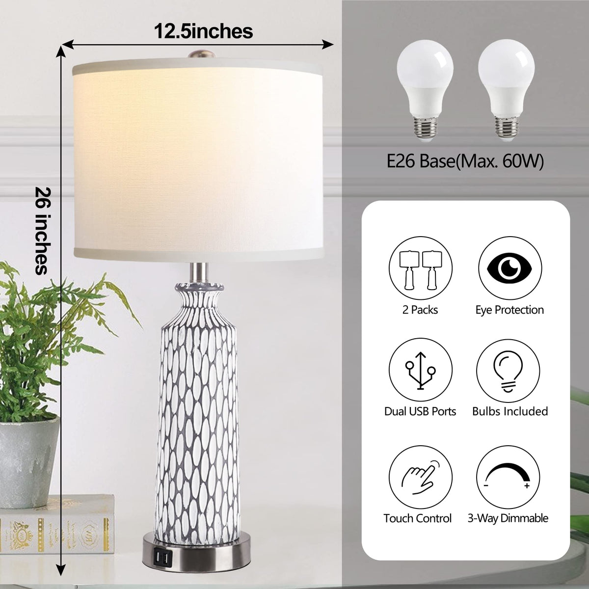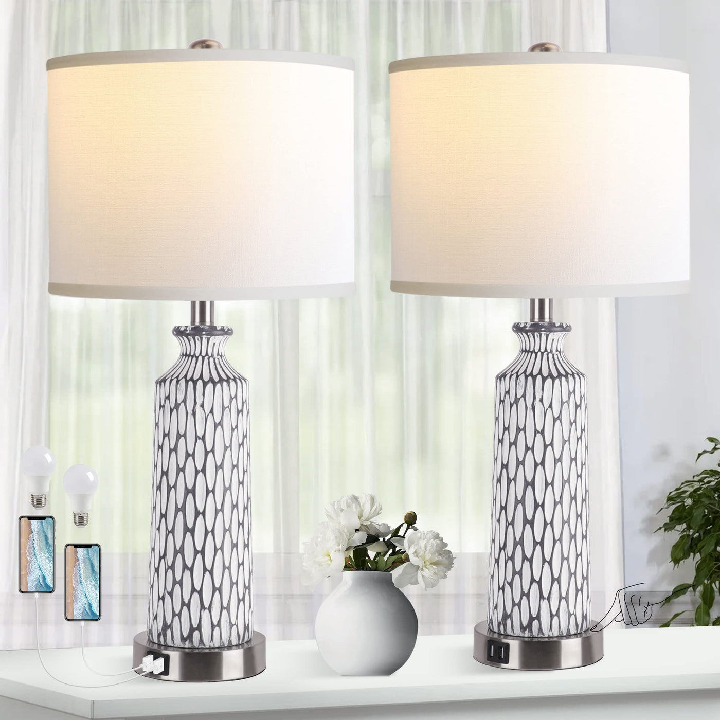 Qimh Set Of 2 Dimmable Touch Control Table Lamps With Usb Ports, Grey White Resin, 2700K Led Bulbs