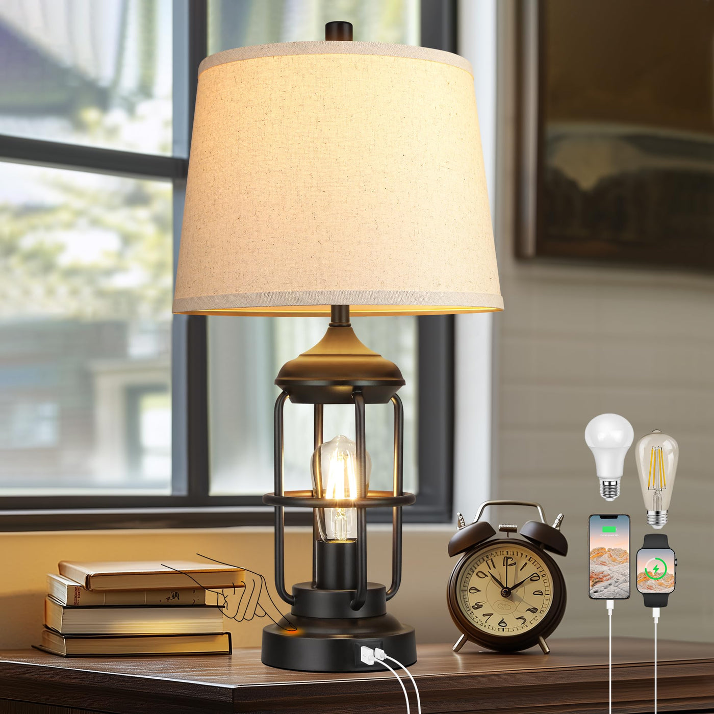 Qimh Table Lamp For Bedroom With Usb A+C Ports, Farmhouse Bedside Lamp With Night Light, 3-Way Dimmable Touch Control, Rustic In