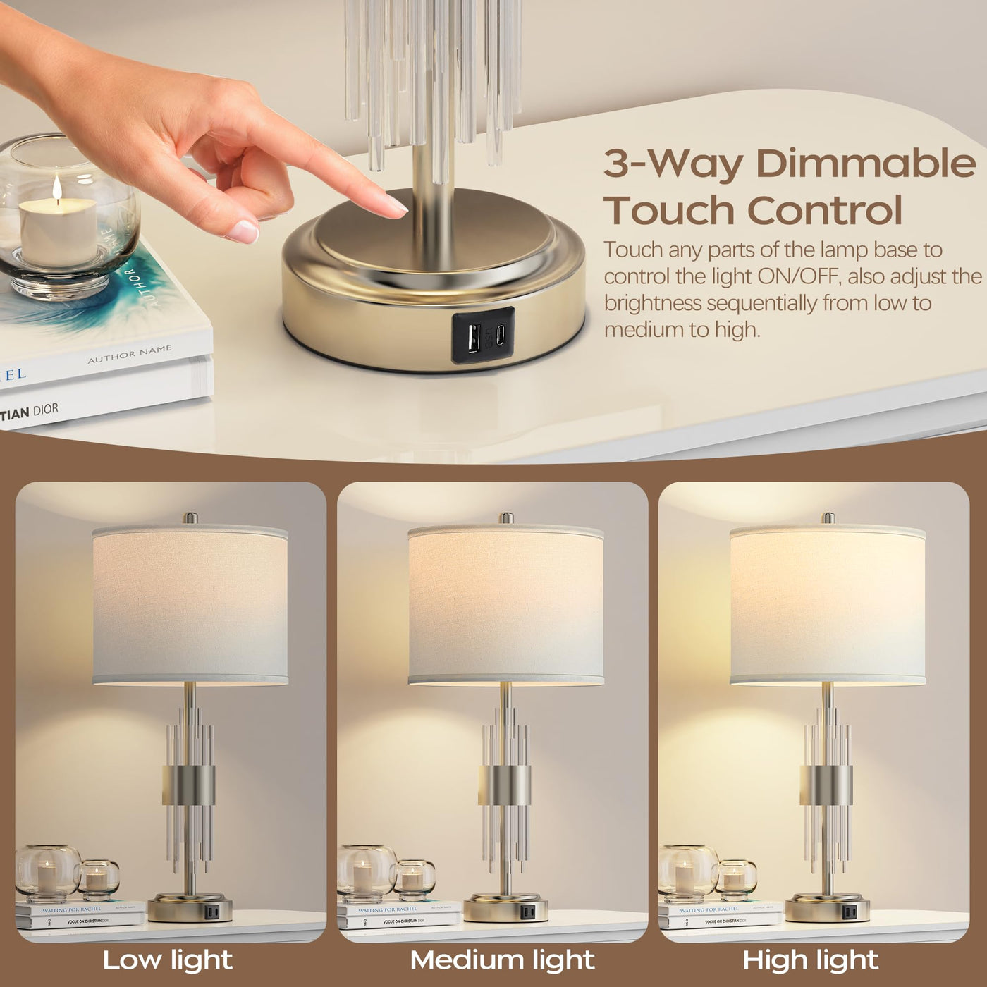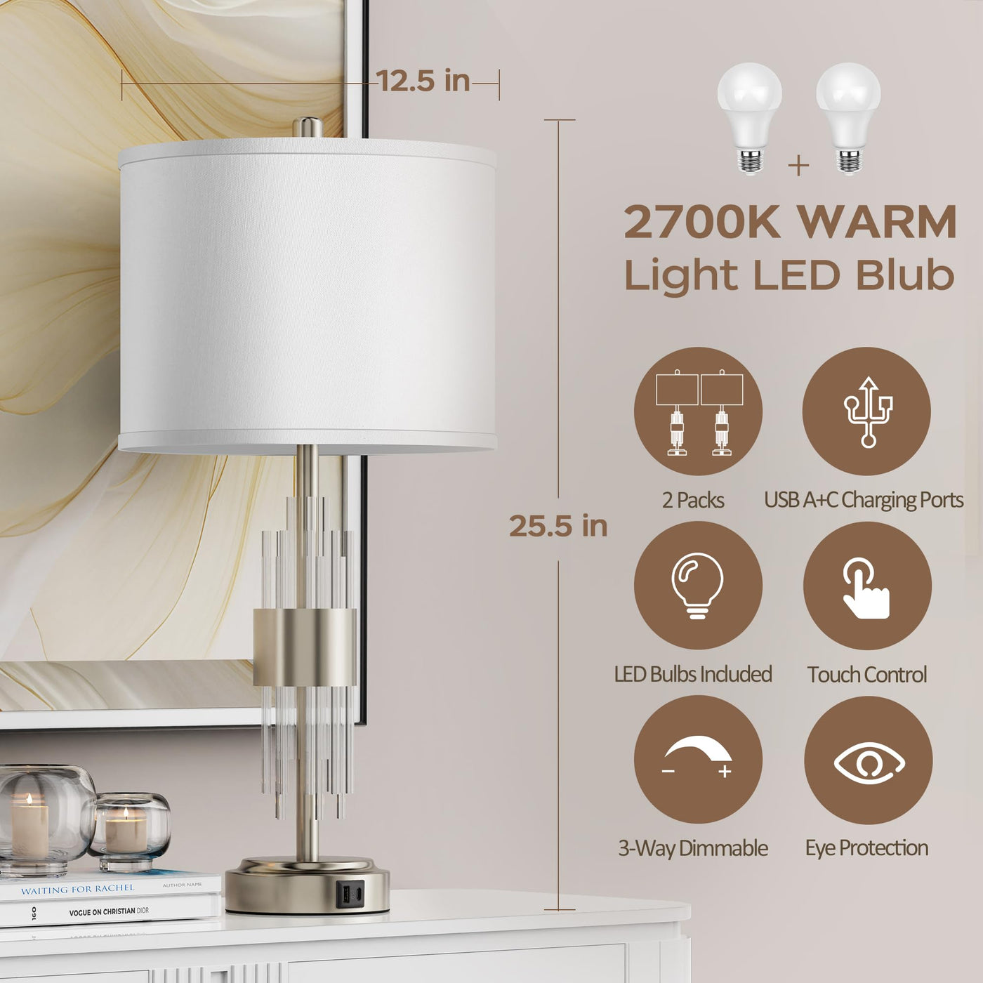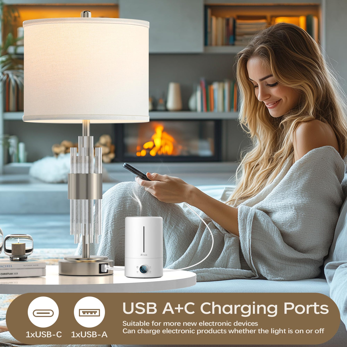 Qimh Table Lamp For Living Room,Bedside Lamp For Bedrooms Set Of 2 With Usb A+C Ports,3-Way Dimmable Touch Control,Modern Nights