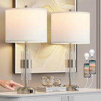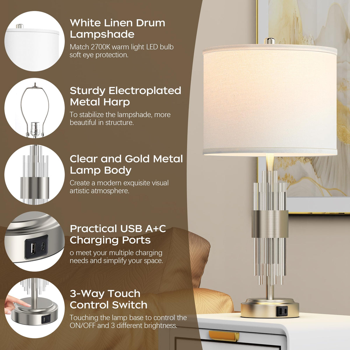 Glam Luxury Contemporary Modern Silver Table Lamp By Qimh.25 1/2'' High Overall. The Shade Of The Lamps For Living Room Is 9'' High X 12.5'' Wide. The Bottom Base Is 5.5'' Wide. Use An E26 Standard Bulb Base That Supports A Maximum Of 60 Watts (Bulb Included). Touch Control Switch.Brushed Silver Finish Over Metal Construction. Clear Tube Accents. White Drum Shade.Includes 5-Foot Long Clear Cord And Plug. A Great Addition To A Bedroom, Living Room, Or Family Room.