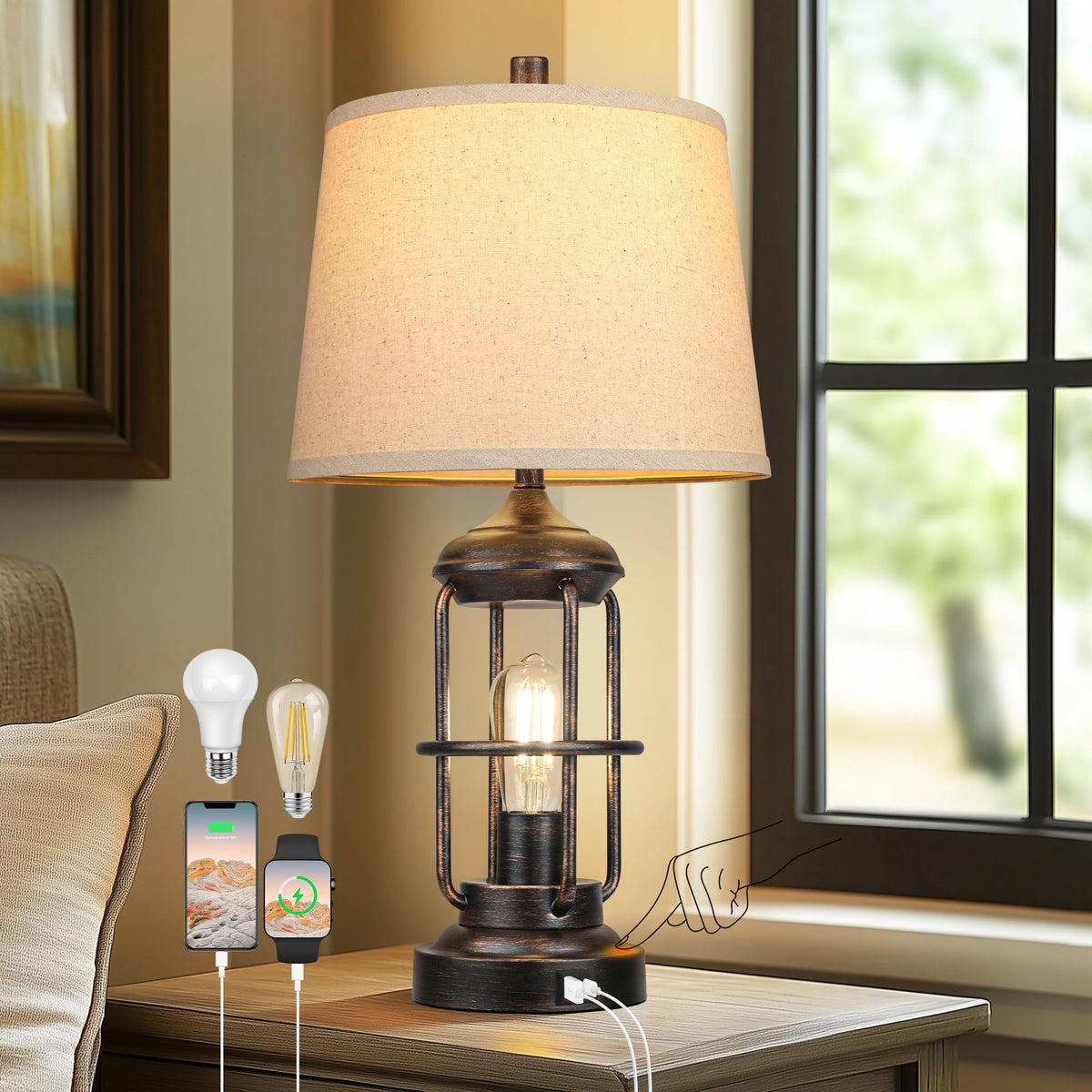 Qimh Touch Control Industrial Lamp for living room with USB ports The rustic lamps for bedrooms with high-quality metal finish and spray paint technology are designed to add a cozy and elegant charm to your room.