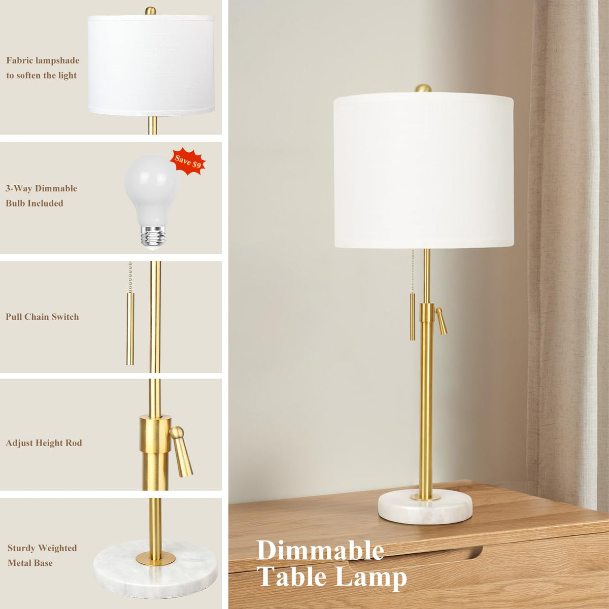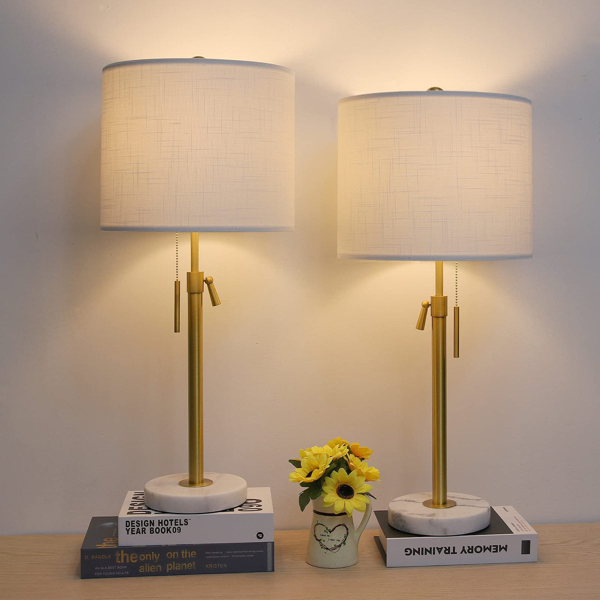 Qingmiao Adjustable Gold Nightstand Lamp Set Of 2, Marble Base, Linen Shade, 22-30" Height