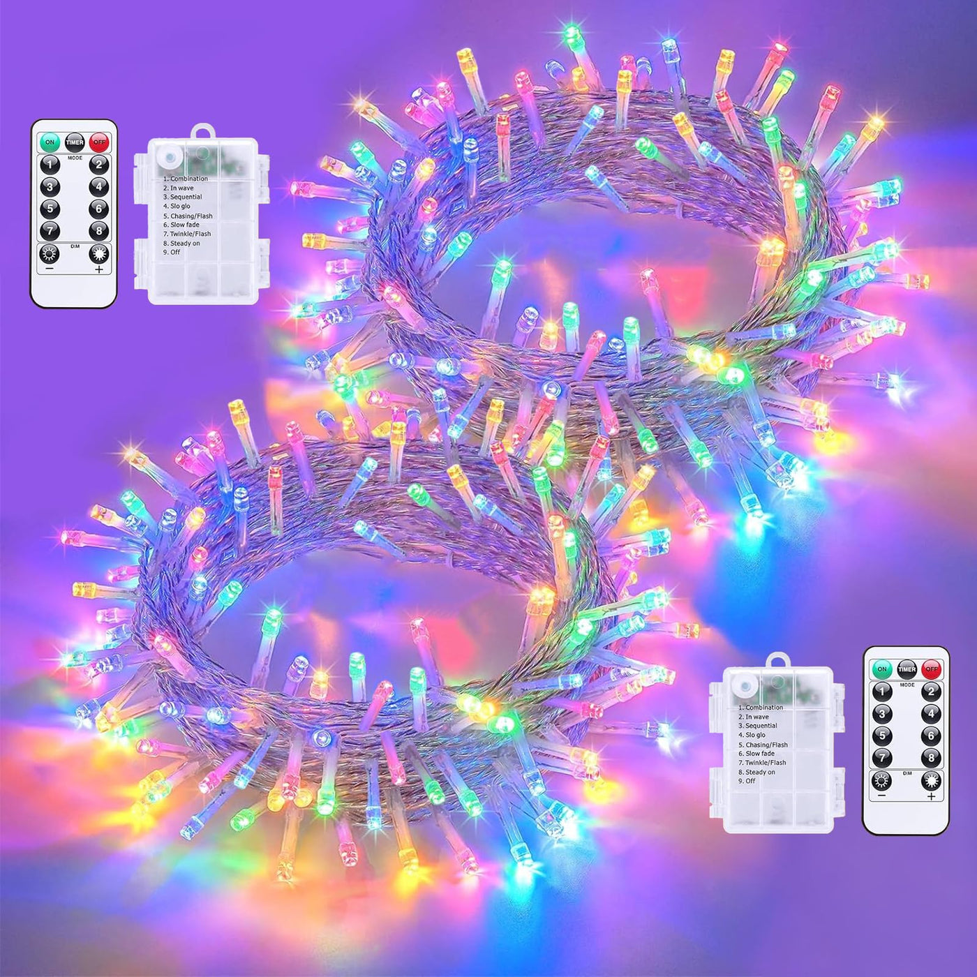 QITONG Battery Operated Christmas Lights, 2 Pack 33ft 100 LED Multicolor Waterproof with Remote, Copper Material