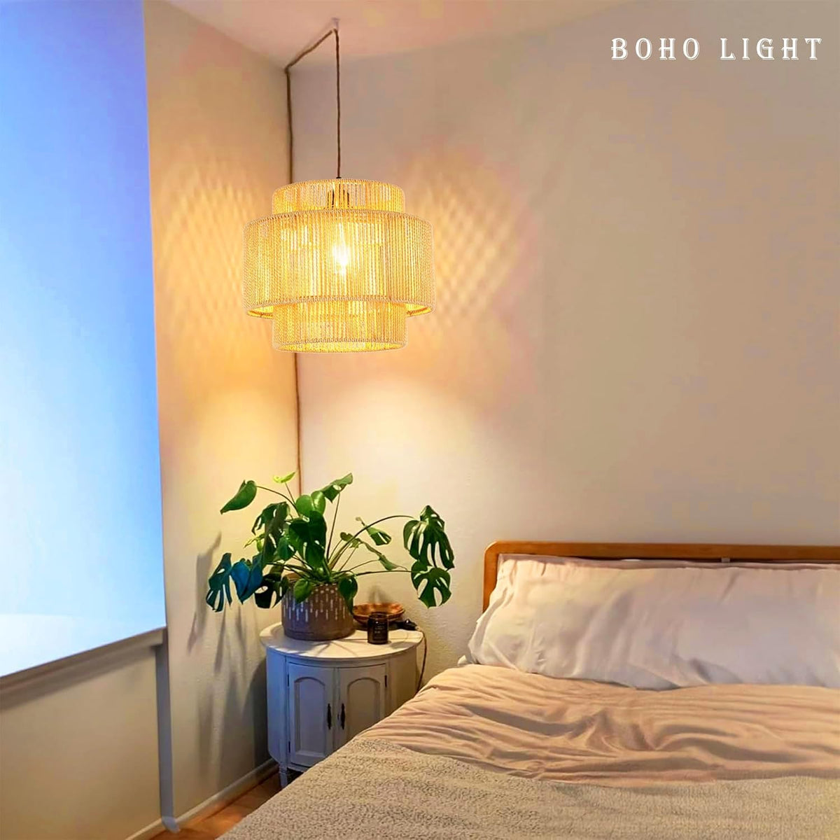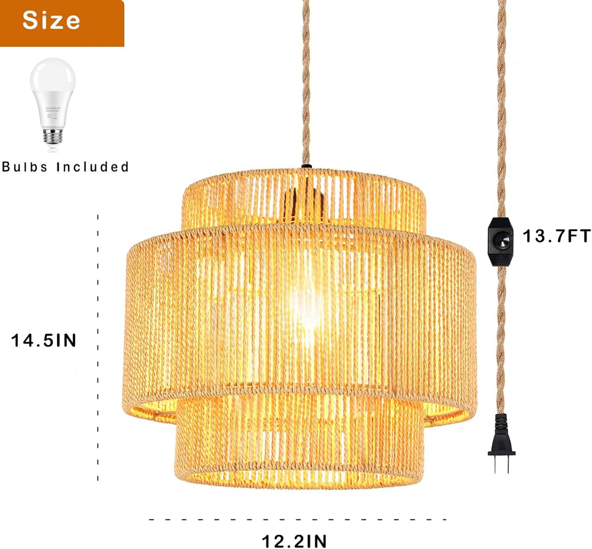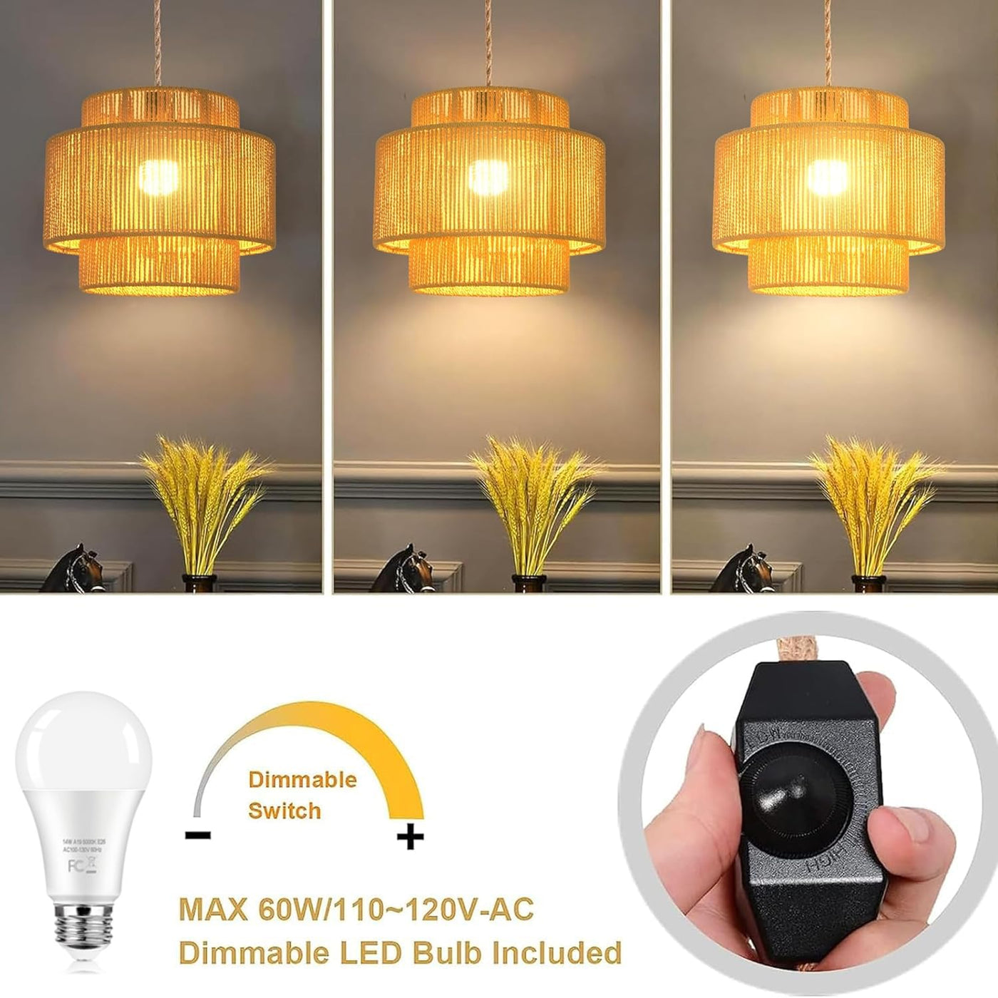 Qiyizm Dimmable Plug-In Pendant Light, Rattan Wicker Shade, Boho Ceiling Fixture For Home