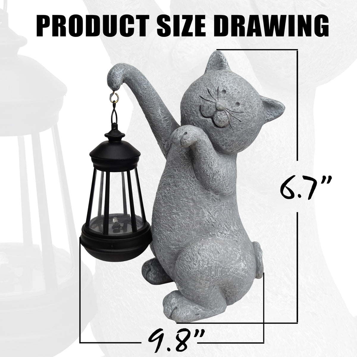 This Cat Solar Outdoor Statues Made Of Resin Material, Hand-Painted And Finished With A Uv Resistant Coating.The Size Of This Cat Is 6.7X5.12X9.8Inches,The Lantern Is 5.5X2.75X2.75Inches.This Charismatic Cat Gracefully Holding A Solar Lantern.It Is Look Beautiful And Add A Touch Of Elegance To My Patio And Lawn. The Soft Glow Of The Led Lights Creates A Charming Ambiance In The Evening, Making It A Perfect Spot To Relax Outdoors.It Can Be Widely Used To Such As Pathway, Flower Beds, Lawn, Yard, Patio, Garden, Balcony And So On. This Cat Figurine Lights Also Can Be Used As Porch Decor And Even Indoor Decor And Keep In Mind That The Solar Lanterns Need To Be Placed In An Area That Receives Sunlight During The Day, To Make Sure They Can Charge The Battery And Turn On At Night.It Is Also The Perfect Gift For Various Occasions, Such As Christmas, Easter, Mother'S Day, Housewarming, Birthdays, Anniversaries, Weddings And More.