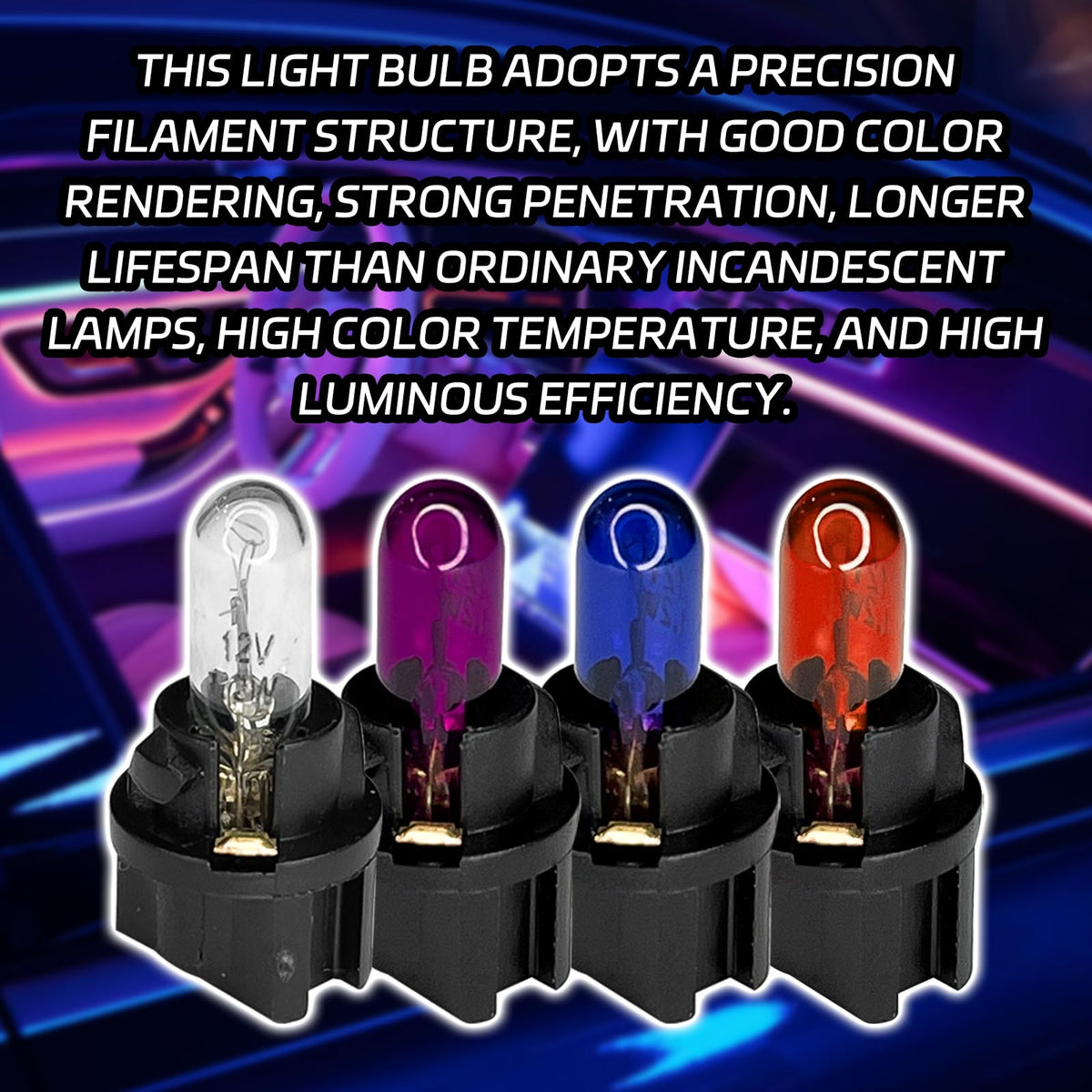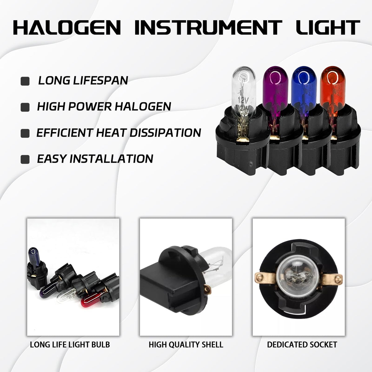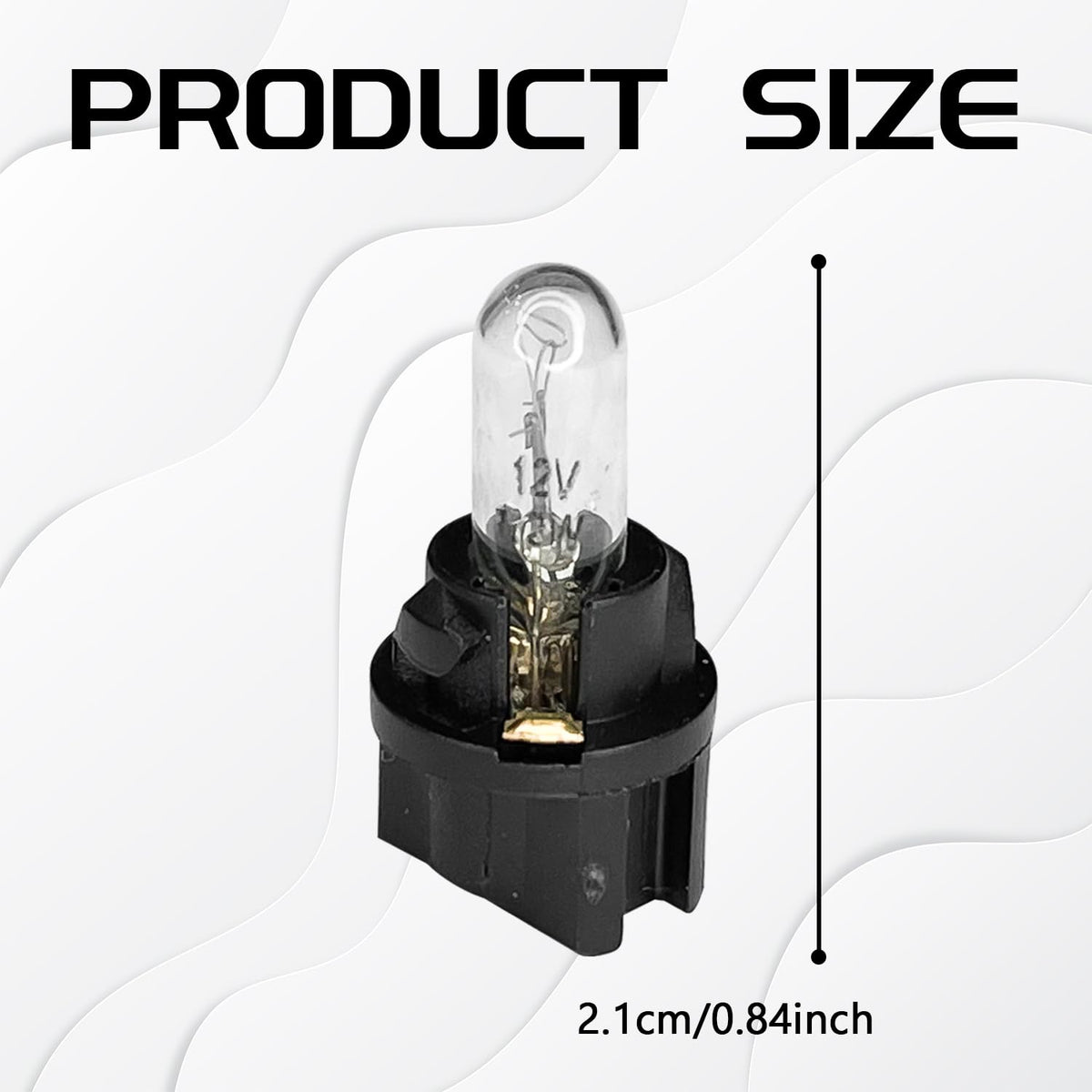 ? Current: 0.08 (A) / Service Life: 50000 (Hours) ? Voltage: 12 (V) / Power: 2 (W) / Light Source: 3030 [Product Information] ? Size: Socket: 0.48*0.44*0.44 Inch / Halogen Bulb: 0.72*0.19*0.19 Inch ? Weight: 0.87 Oz ? Color: White/ Blue/ Red ? Material: Tungsten Plastic Glass ? Package: 20*Halogen Light Bulbs 20*Twist Lock Sockets [Installation Method] ? Switch Off The Car S Engine And Open The Car Door For Easier Access To The Instrument Cluster ? Locate The Old Instrument Cluster Lights That Need To Be Replaced ? Carefully Remove The Old Lights By Gently Pulling Them Out ? Insert The Instrument Cluster Light Bulbs Into The Empty board-style ? Test The Lights By Switching On Your Car S Ignition