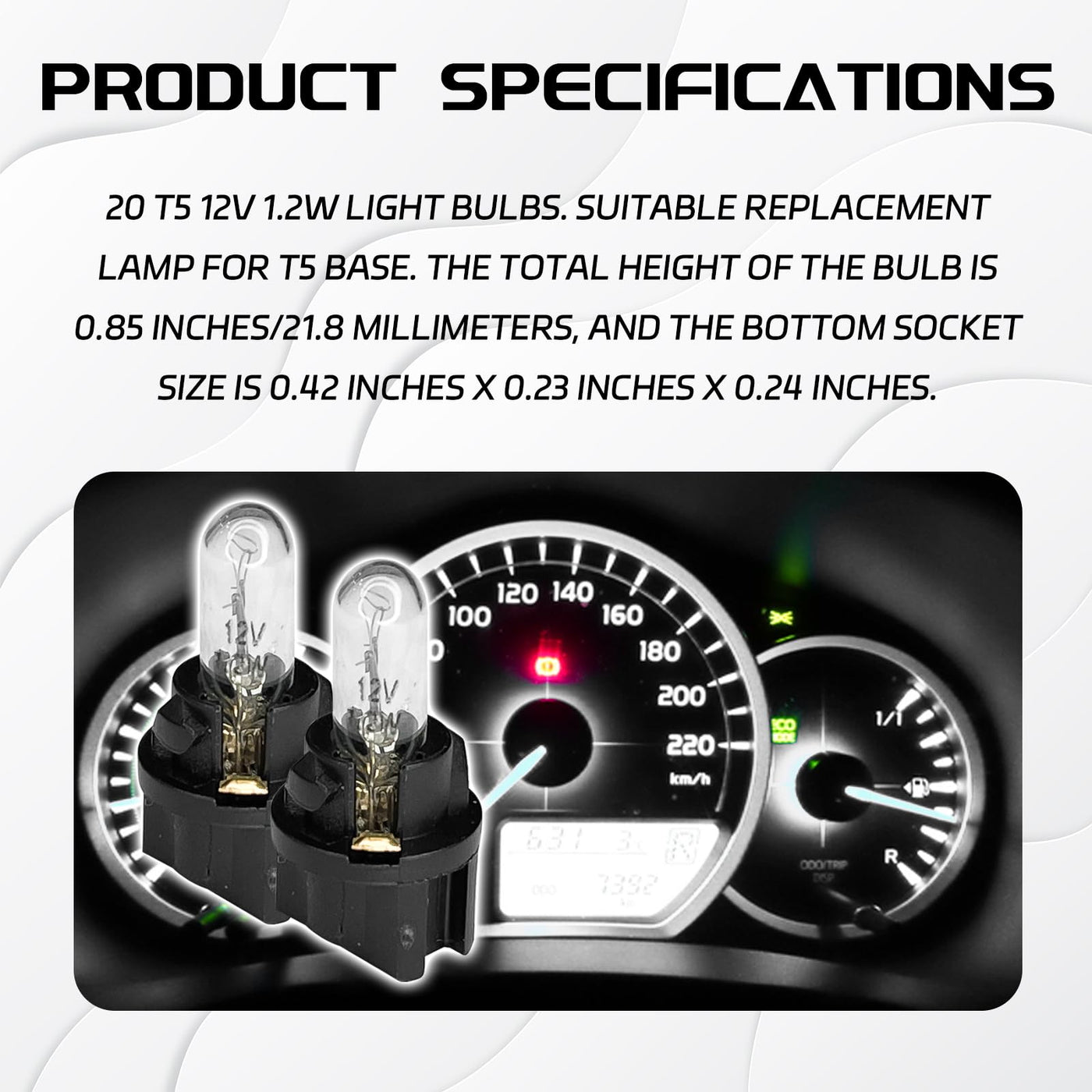 Qqwd 20Pcs T5 17 57 86 Halogen Instrument Cluster Bulbs Kits 12V Dash Light For Car Interior Automotive Replacement Gauge Cluster Panel Bulb With T5 Sockets Universal Lighting Accessories(White