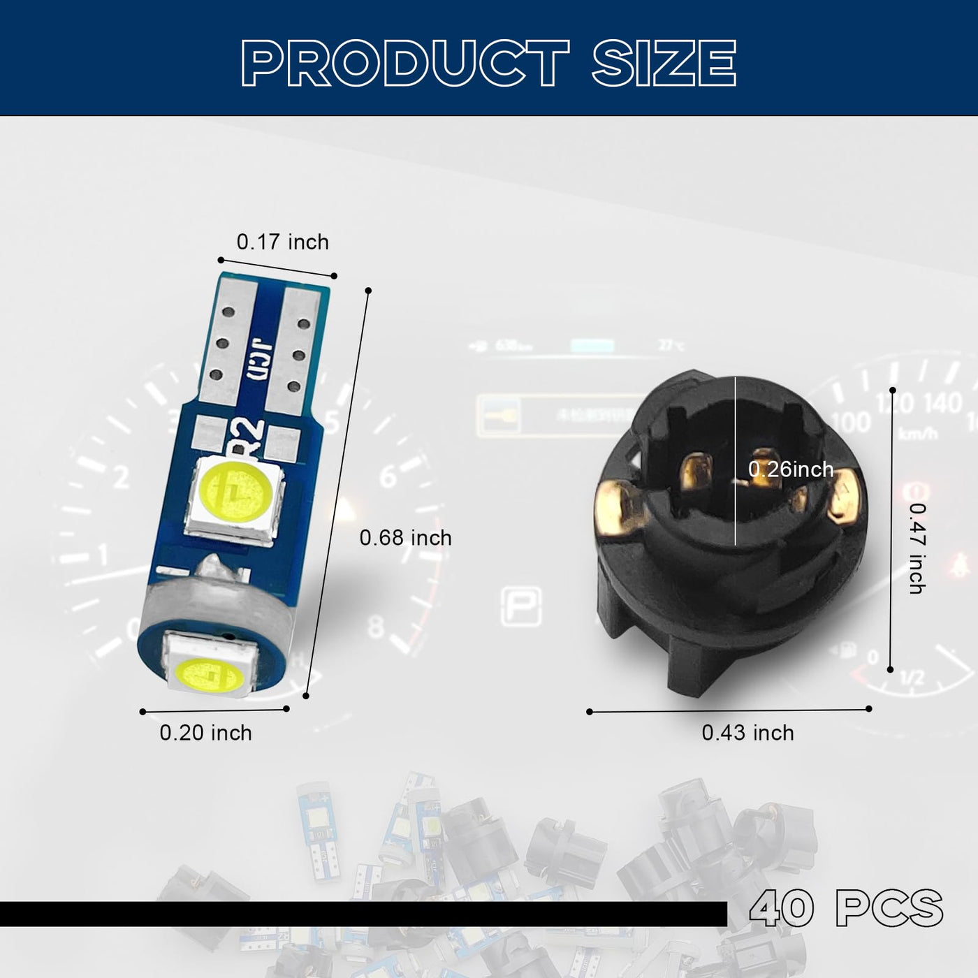 1. Size is about 0.63inch x 0.2inch.Power: 1W/pair, 0.5W/bulb.2.Plug and play, easy to install, just remove the old bulb and install the new LED bulb in place.3.Scope of application: Instrument lamps, display lamps, reading lamps, door lamps, license plate lamps, tailgate lamps, console lamps, interior lamps and so on.
