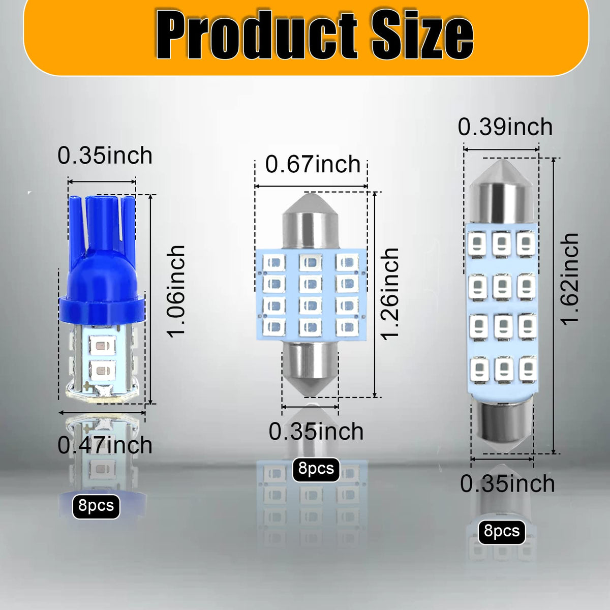 Q: What are the available sizes for the LED bulbs?A: The QuicTO LED Interior Light Set offers three sizes: 25mm x 10mm, 30mm x 31mm, and 40mm x 10mm, allowing you to choose the perfect fit for your vehicle's lighting needs.