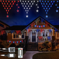 ?CHARMING DISPLAY?: The 218 LED Christmas light is 13.8 feet long and consists of 6 inverted triangular net lights and 12 dangling stars. Clear lead wire: 16.5 feet, drop lengths: 15.8 inches and 25.6 inches. | ?8 LIGHTING MODES?: 8 lighting modes including steady on, sequential, slow fade, twinkle, and more for a customized ambiance. The built-in timer will be automatically 6 hours ''on'' and 18 hours ''off'' every day until reset or turned off manually. | ?IP55 WATERPROOF?: Constructed with waterproof materials, the curtain fairy lights are suitable for indoor and outdoor use during the holiday season. (Note: The plug is NOT waterproof, keep it away from water.) | ?ENERGY-EFFICIENT?: Powered by a low-voltage adapter (included) for safe and energy-efficient operation. A great addition to your Christmas light display! | ?LIGHT UP YOUR CHRISTMAS?: Flexible PVC cord enables easy wrapping or draping along railings, eaves, or structures. Bright and beautiful hanging net lights for Christmas-themed parties and holiday decorations.