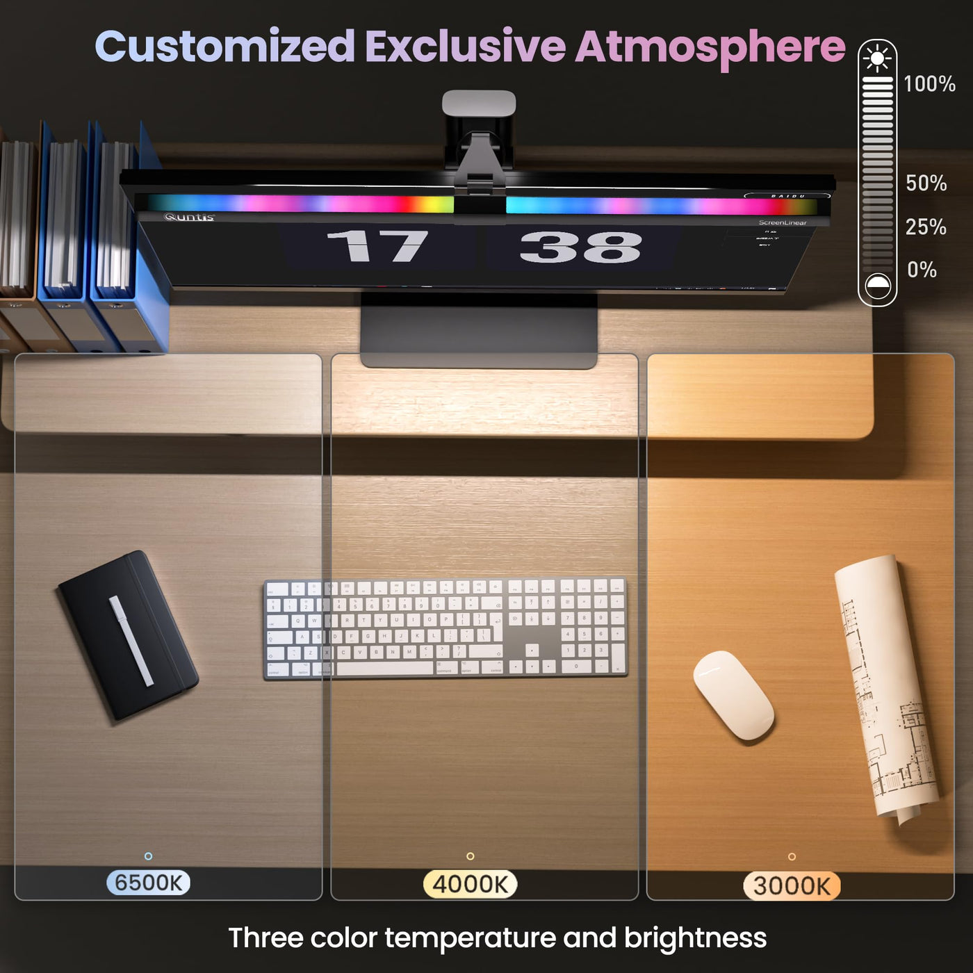 Q: What are the adjustable color temperatures of the Quntis Monitor Light RGB PRO?A: The Quntis Monitor Light RGB PRO features four adjustable color temperatures: 3000K, 4000K, 5000K, and 6500K, allowing you to customize the lighting to suit different moods and tasks.