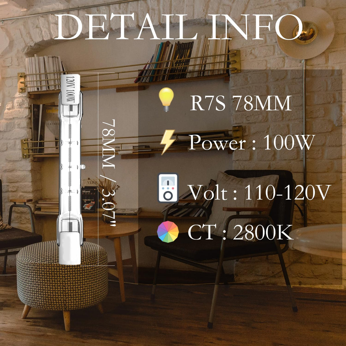 Illuminate Your Space With These Versatile R7S J78 Halogen Bulbs. This 2-Pack Of 100W T3 Jtype Linear Halogen Lamps Operates At 120V, Making Them Perfect For Various Lighting Applications. These Replacement Bulbs Are Designed For Work Lights, Security Fixtures, And Landscape Lighting Systems. Each Bulb Features A Durable Double-Ended Design With Robust Contacts For Reliable Performance. The Clear Glass Construction Ensures Maximum Light Output, While The Compact J78 Size Makes Them Easy To Install In Compatible Fixtures. These Halogen Bulbs Provide Bright, Consistent Illumination That'S Ideal For Both Indoor And Outdoor Applications. Whether You'Re Updating Your Security Lighting Or Enhancing Your Landscape Design, These Replacement Bulbs Deliver Dependable Performance. Remember To Handle With Care During Installation And Ensure Your Fixture Is Rated For These Specifications.