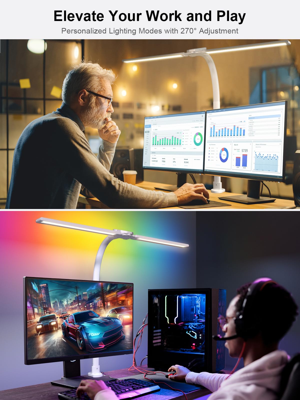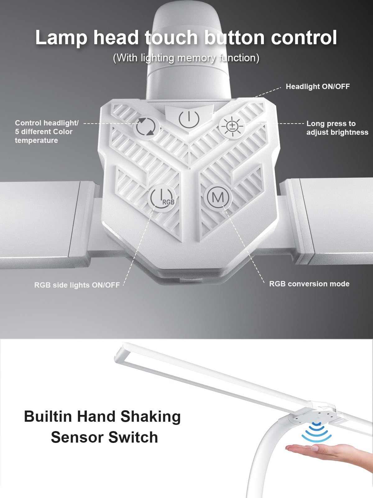 Q: What are the key features of the Radlfut Double Swing Arm Desk Lamp?A: The Radlfut Double Swing Arm Desk Lamp features a 2-in-1 design with dual adjustable heads, offering 24W of LED brightness. It includes multiple lighting combinations, RGB atmosphere lighting, a touchless power control, and a memory function to retain your last used settings.