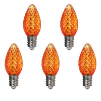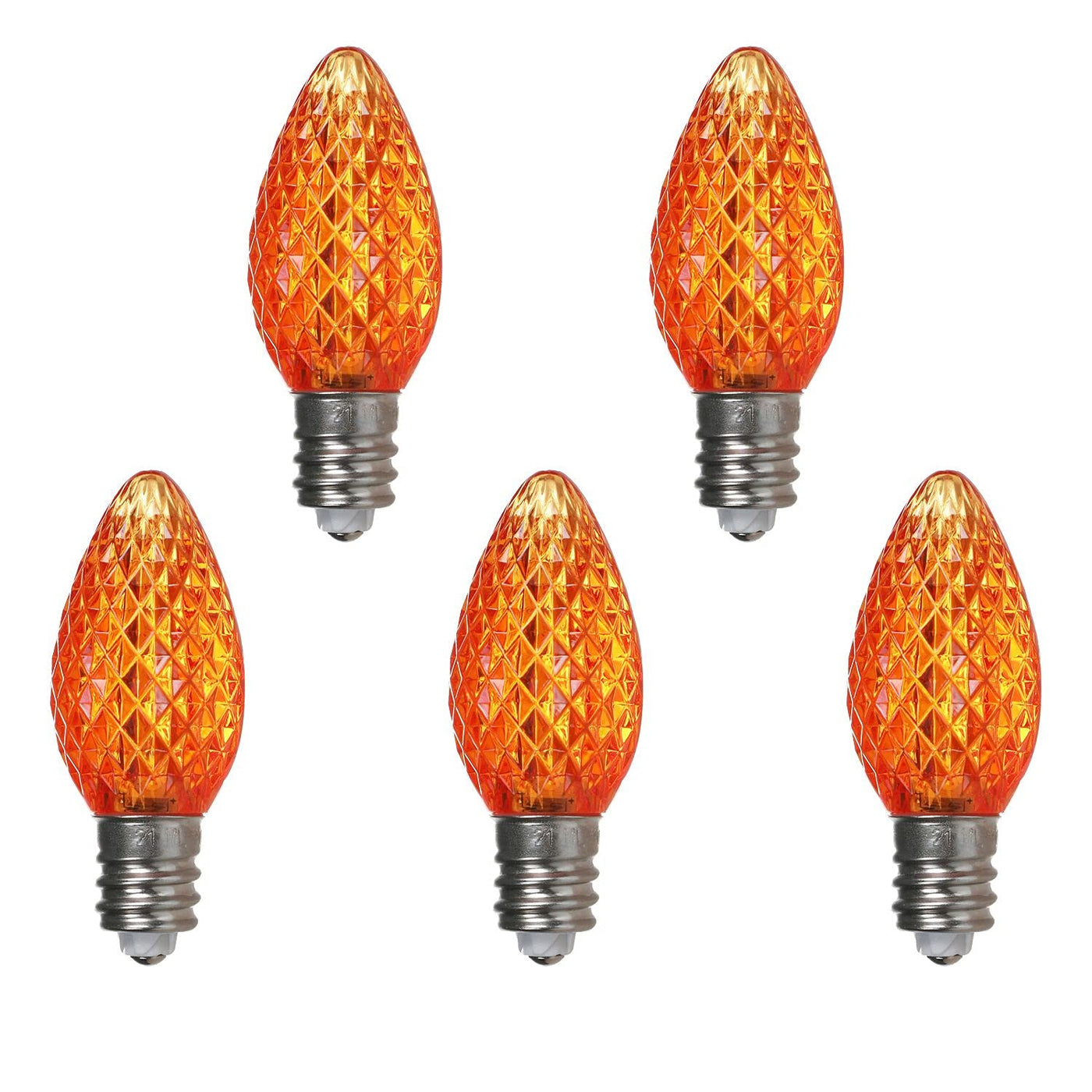 Diamond Faceted Design:The light of the C7 led replacement bulbs will reflect from the faceted surface same as the diamond, like vivid and natural light, create comfortable atmosphere. Diamond faceted bulb design reflects a spectacular light and color.Energy Saving:You save more than 90% energy by using our C7 twinkle replacement bulbs.Waterproof:New machine base, outstanding waterproof performance.waterproof level is IP 65.The C7 led replacement bulbs can be used for outdoor/indoor decoration.Cool to Touch:No worries with outdoor decoration when using c7 led bulb.Highly Durable:The c7 led bulb construction with a lifespan up to 60,000 hours.Box included:25 x C7 led replacement bulbsProduct description:Model:c7 led bulb.Base Type:E12Dimmable: YesColor:Orange.Wattage: 0.58 wattsInput Voltage: 110V - 130VMaterial: Aluminum, PC(Polycarbonate, Shock-Proof)Beam Angle: 360 degreesLife Span: 30000 hoursSize: 0.75 x 0.75 x 2 inchesCertification: UL Listed & CSA CertifiedCautions:Switch off the power before replacing the lamp.If any doubt about the installation or use of the C7 led replacement bulbs, please consult a competent electrician.Our C7 led replacement bulbs for holiday decorations.
