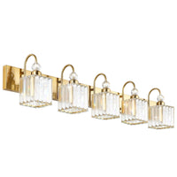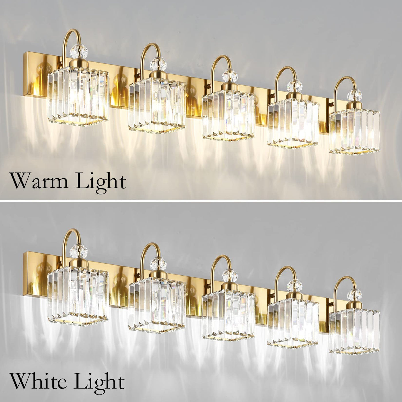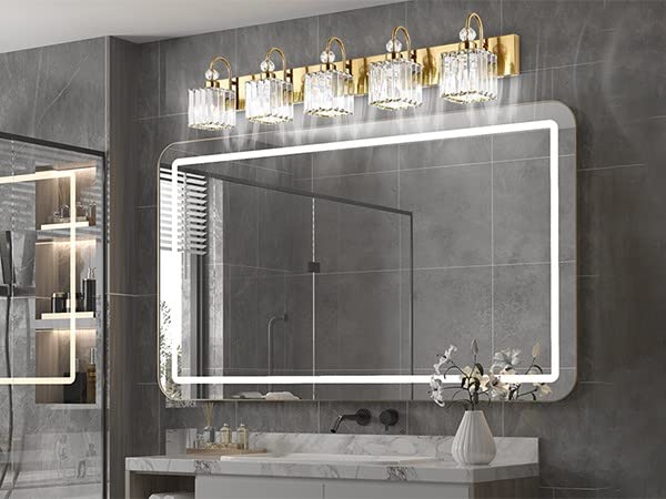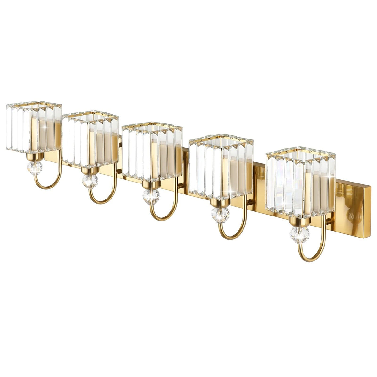 Ralbay Gold Bathroom Light Fixtures Crystal 5-Lights Bathroom Vanity Lights Over Mirror Modern Crystal Gold Bathroom Vanity Lighting