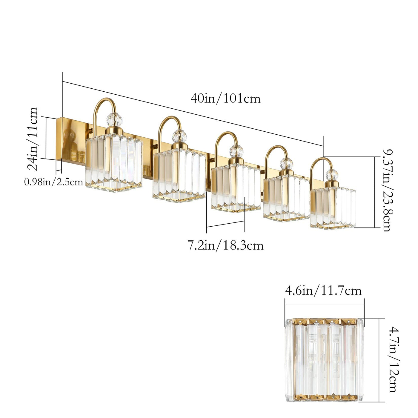 Q: What are the dimensions of the Ralbay Gold Crystal Vanity Light?A: The Ralbay Gold Crystal Vanity Light measures 40 inches in length, 9.37 inches in width, and extends 7.2 inches from the wall, making it a stylish addition to various bathroom spaces.