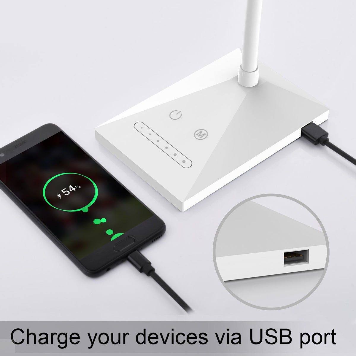 The RAOYI White USB Charger Lamp is a versatile desk lamp designed to enhance your workspace or bedside table. With its touch-sensitive controls and adjustable features, this lamp provides optimal lighting for reading, studying, or working.