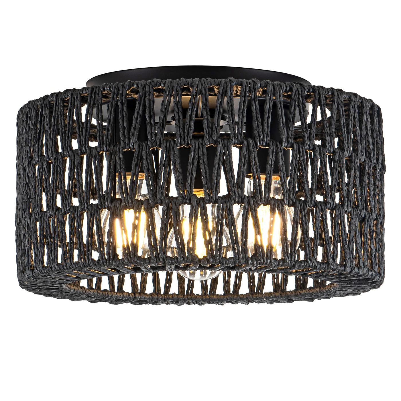 Rattan Ceiling Light Fixture, 3-Light Bohemian Modern Woven Ceiling Light, Black Boho Flush Mount Ceiling Light For Bedroom Living Room Dining Room, Bulb Not Included