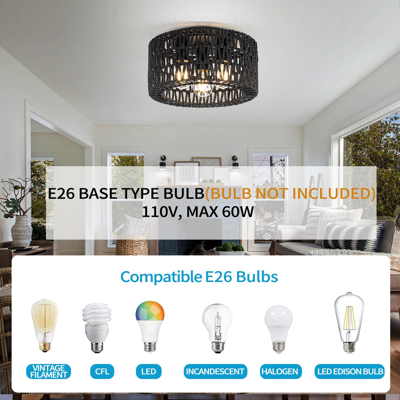 Q: What type of bulbs are compatible with the Rattan Ceiling Light Fixture?A: The Rattan Ceiling Light Fixture requires three standard E26 bulbs. You can use incandescent, Edison, CFL, or LED bulbs. Please note that bulbs are not included with the purchase.