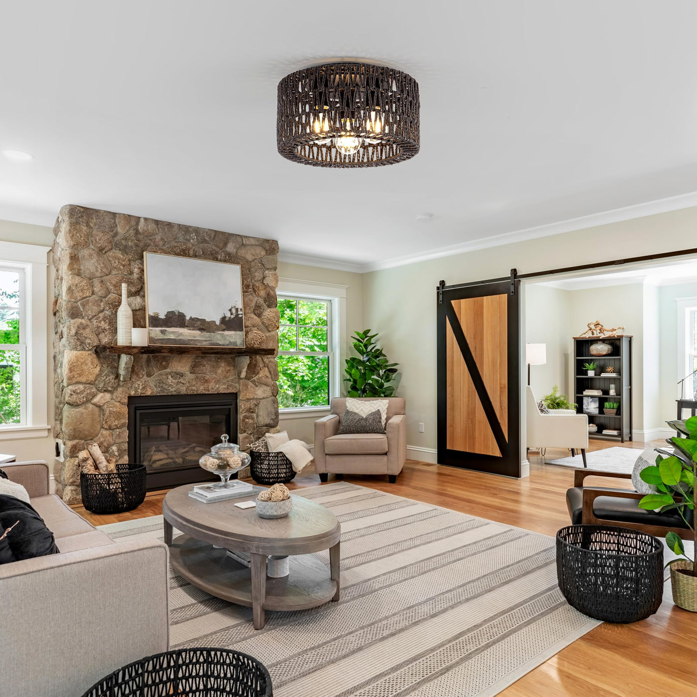Rattan Ceiling Light Fixture, 3-Light Bohemian Modern Woven Ceiling Light, Black Boho Flush Mount Ceiling Light For Bedroom Livi