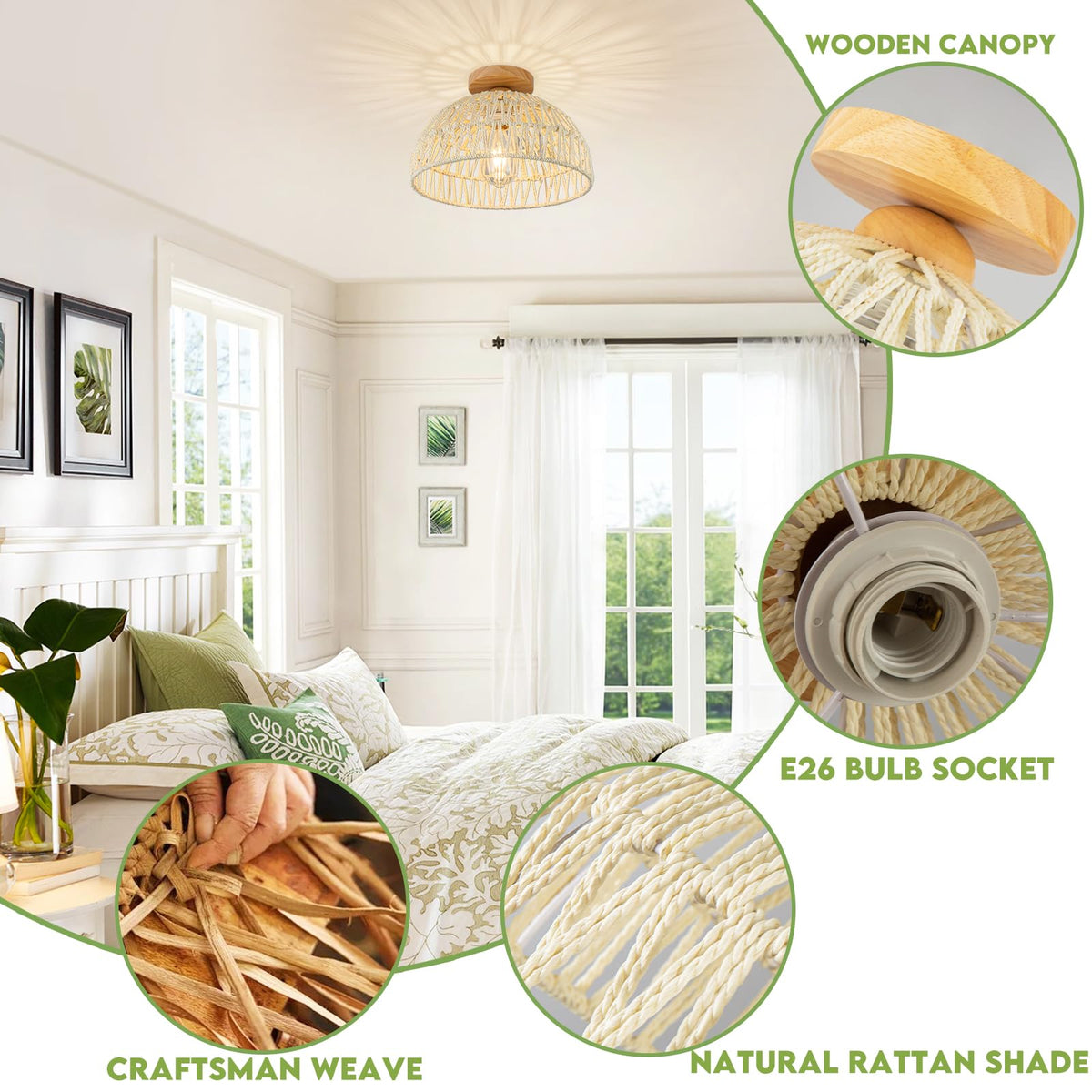 Rattan Chandelier Specification Retro Design Meets Vintage Craftsmanship In Our Boho Light Fixture Ceiling Mount,The Dome Lampshade Reflects The Vidid Light Throughout Your Room Ceiling,Creating A Charming Shadow And A Warm Ambience.If You Like A Boho Style, This Rattan Ceiling Light Is Perfect!! Voltage:Ac120V Power Source:Hardwired Power Max.:60W Material:Metal/Rattan/Wooden Shade Color:Wooden Mount Type:Flush Mount Chandelier Light Direction:Multiple Directions Color:Cream White/Beigechandelier Size: Diameter12.6 Inches* Height*8.6 Inches, Lamp Base 5.1Inches. Bulb Socket:E26 Recommended Bulb:Led/Incandescent/Halogen/Fluorescent/Dimmable Bulb Widely Use:The Beach Light Fixture Is Perfect Gift For House Warming Family Or Friends,Ideal For Foyer,Kitchen Island,Dressing Room,Hallway,Entryway,Bedroom,Dining Room,Living Room,Bathroom,Home Office.